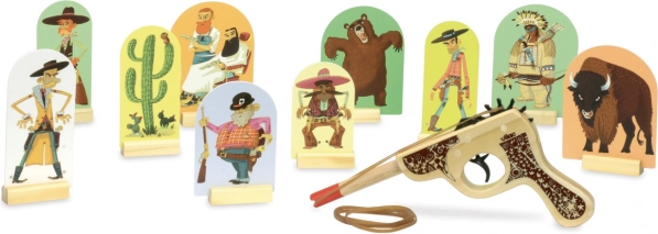 Seadke märklaudad üles, pingutage kummipael ja kutsuge pere või sõbrad elutoas duellile. Kvaliteetne puidust teostus tagab vastupidavuse ja pika eluea, samas kui atraktiivne vesternidisain vaimustab väikeseid laskureid.