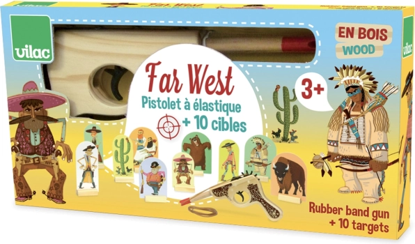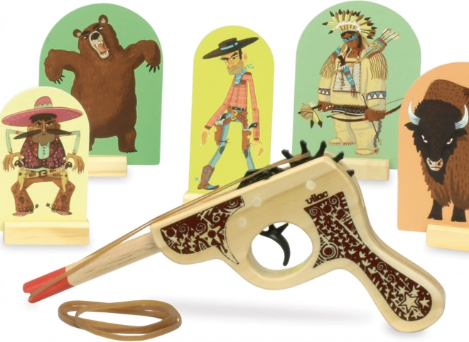 Koge Metsiku Lääne atmosfääri VILACi puidust märklaudadega püstoliga. Mäng sobib lastele alates 3. eluaastast ning aitab harjutada täpsust, keskendumist ja peenmotoorikat. Piisab, kui tõmmata kummipael pingule, seada märklaudad paika ja hakata sihtima – lõbu kogu perele.