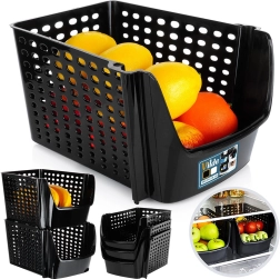Sobib puu- ja köögiviljadele, samuti majapidamiskeemiale või kontoritarvetele. Mitut korvi saab stabiilselt virnastada ja ruumi säästa.