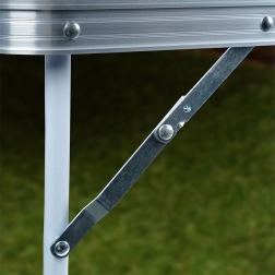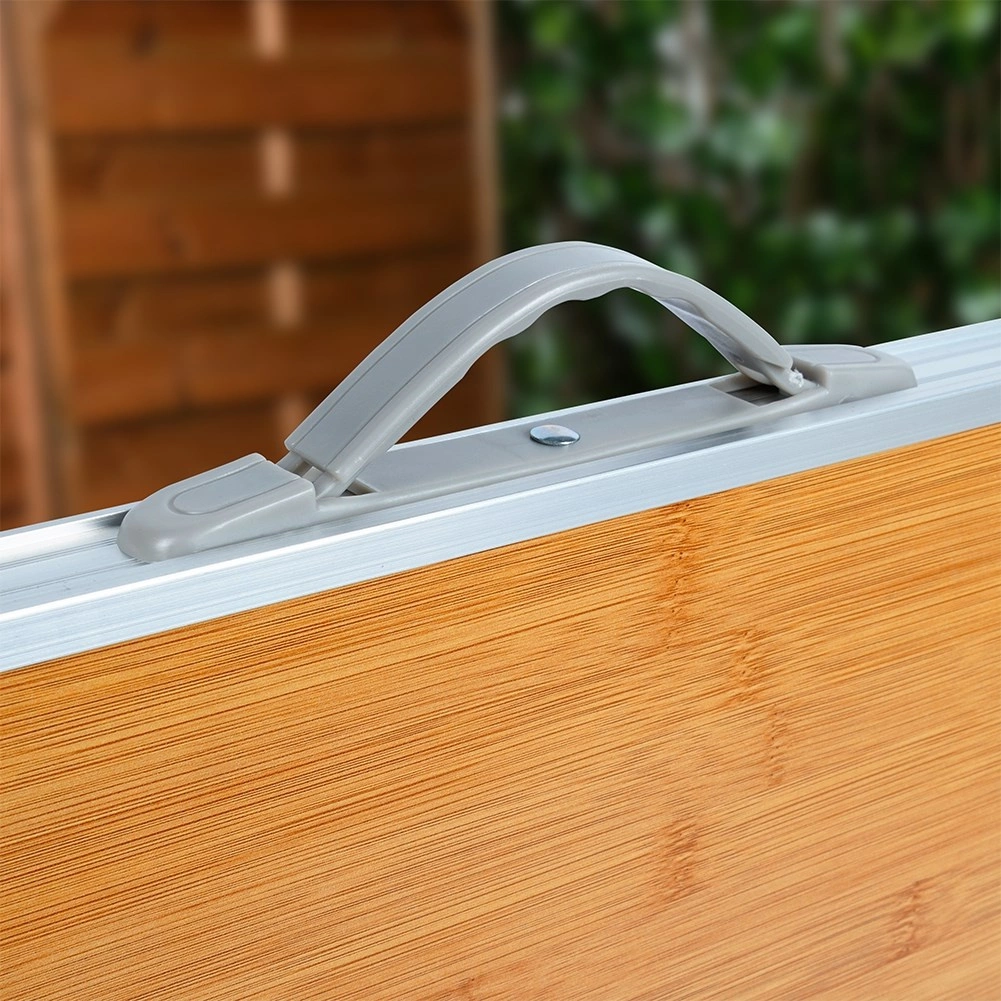 Kerge ja vastupidav kokkupandav laud sobib suurepäraselt aeda, rõdule, terrassile ning kaasavõtmiseks – telkimiseks, matkamiseks või piknikule. Moodsa puitdekooriga MDF-plaati kaitseb spetsiaalne pinnatöötlus, alumiiniumäär ja terasest jalad tagavad stabiilsuse ja pika kasutusea. Kokkupanduna on laual kompaktsed mõõtmed ja lameda kohvri kuju mugava sangaga.