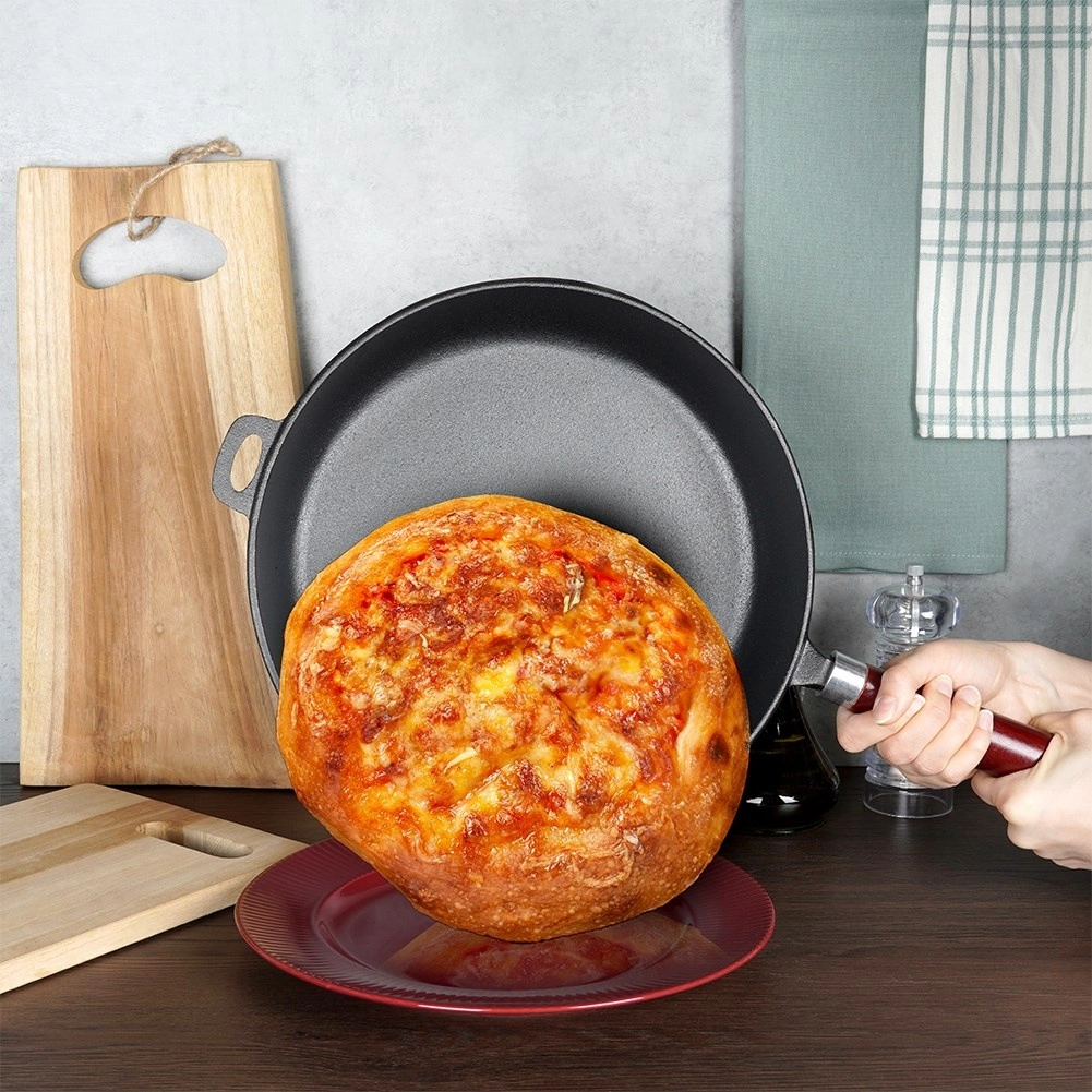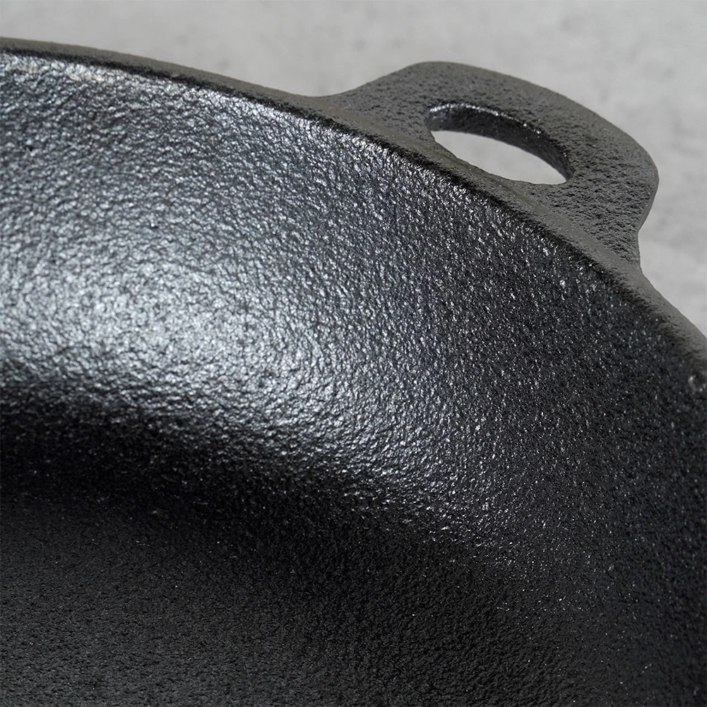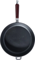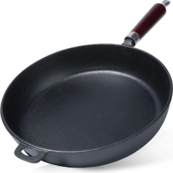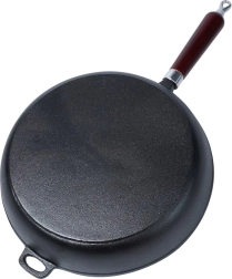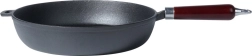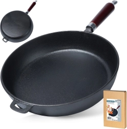 Praktiline puidust käepide tagab kindla haarde, abikäepide lihtsustab käsitsemist ja riputamist. Panni saab kasutada kõikidel pliiditüüpidel, sh induktsioonil, ning samuti grillil või lahtisel tulel. Pärast käepideme lahtikeeramist sobib ka ahju. Ilma mittenakkuvate kateteta – puhas malm loomulikeks tulemuseks.