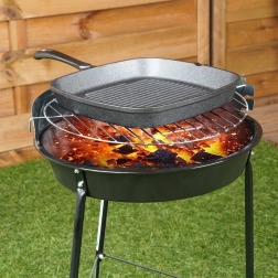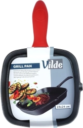 Ruudukujuline malmist grillpann praktilise punase silikoonist käepideme ümbrisega ohutuks teisaldamiseks. Pakub kiiret ja ühtlast soojenemist, suurt soojussäilivust ja ribilist pinda autentsete triipude ning rasva äravoolu jaoks. Sobib gaasi-, elektri-, keraamilisele, halogeeni- ja induktsioonpliidile, ahju ning ka lahtisele tulele või grillile.