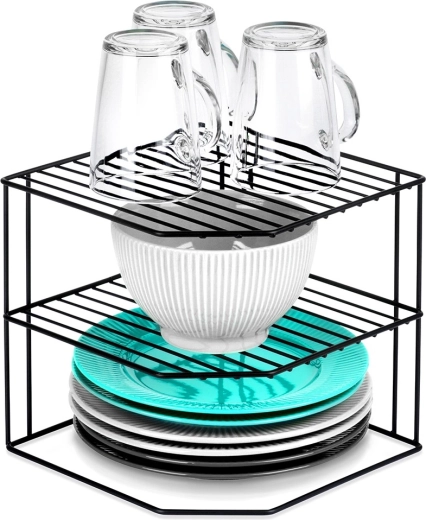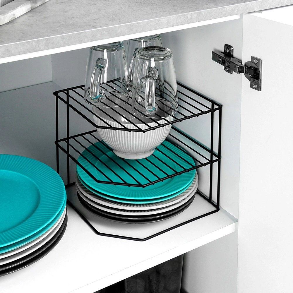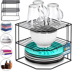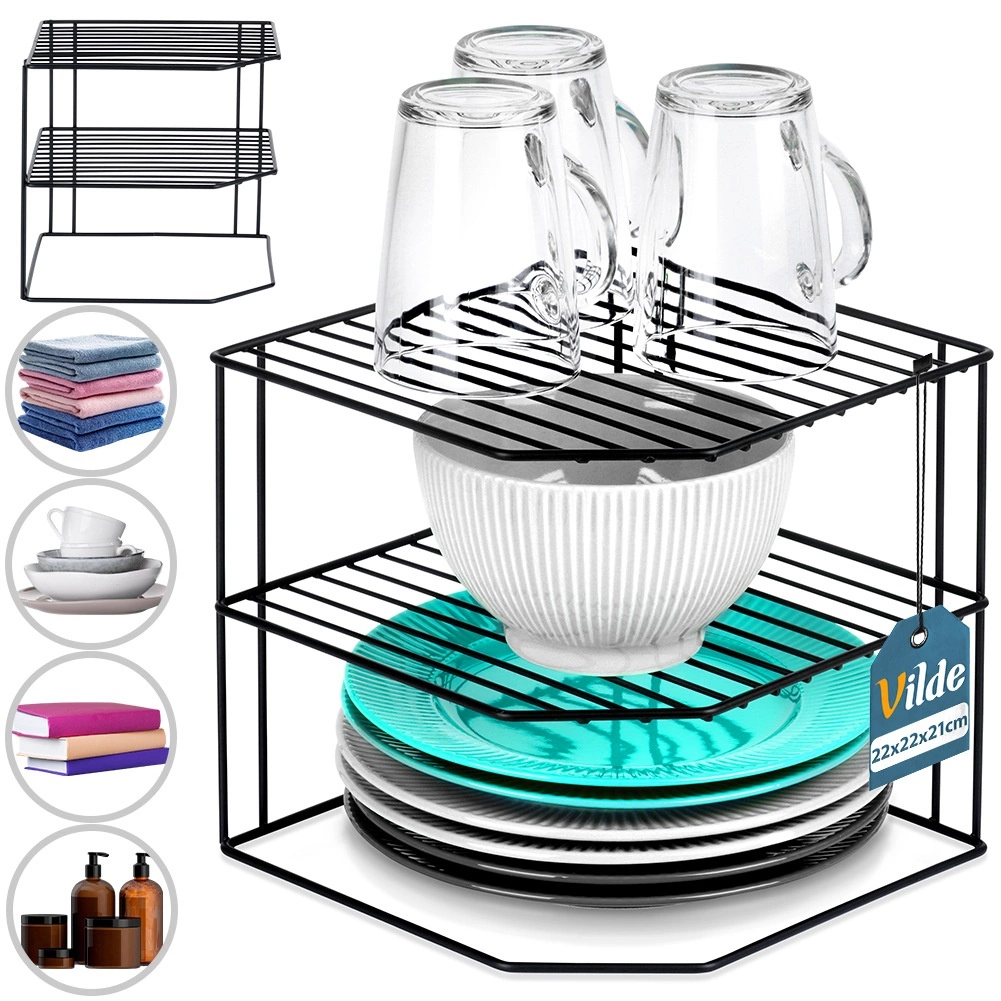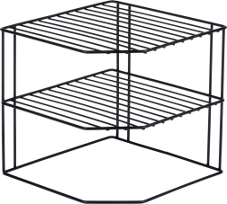 See kööginurgariiul mõõtudega 22 × 22 × 21 cm jagab kapi ruumi kolmeks tasandiks, et taldrikud, kausid, klaasid ja toiduained oleksid paremini paigutatud. Avatud traadist konstruktsioon tagab õhulisuse ja ülevaatlikkuse, samas kui must pulbervärv annab elegantse ilme ja kulumiskindluse.