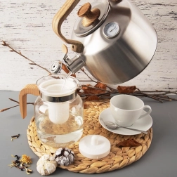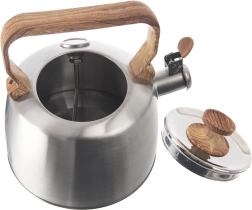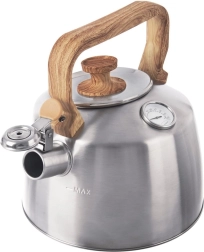 See klassikaline roostevabast terasest teekann ajatult kauni välimusega on loodud vee kiireks kuumutamiseks ja temperatuuri täpseks jälgimiseks. Sisseehitatud analoogtermomeeter aitab seada ideaalse temperatuuri eri teedele ja ürtidele, samal ajal kui vile annab turvalise märguande, kui vesi on keema läinud. Ergonoomiline puiduimitatsiooniga käepide on käele meeldiv ja tagab mugava käsitsemise.