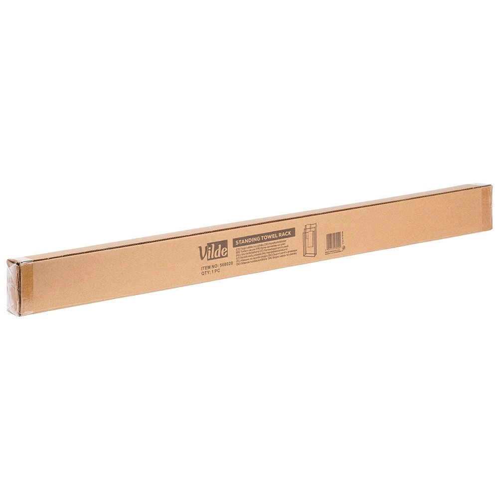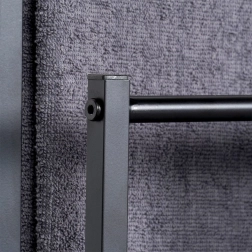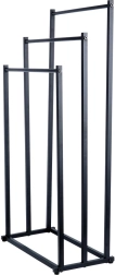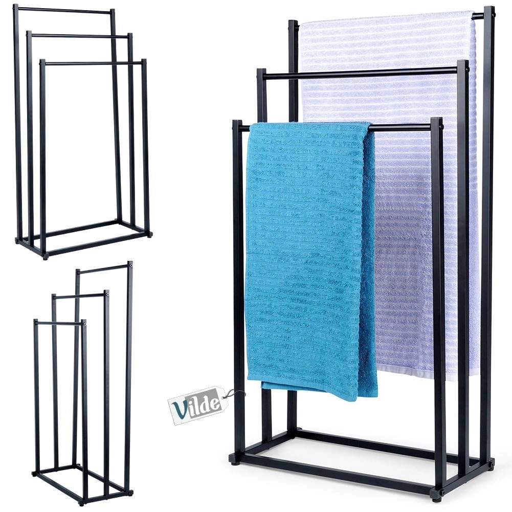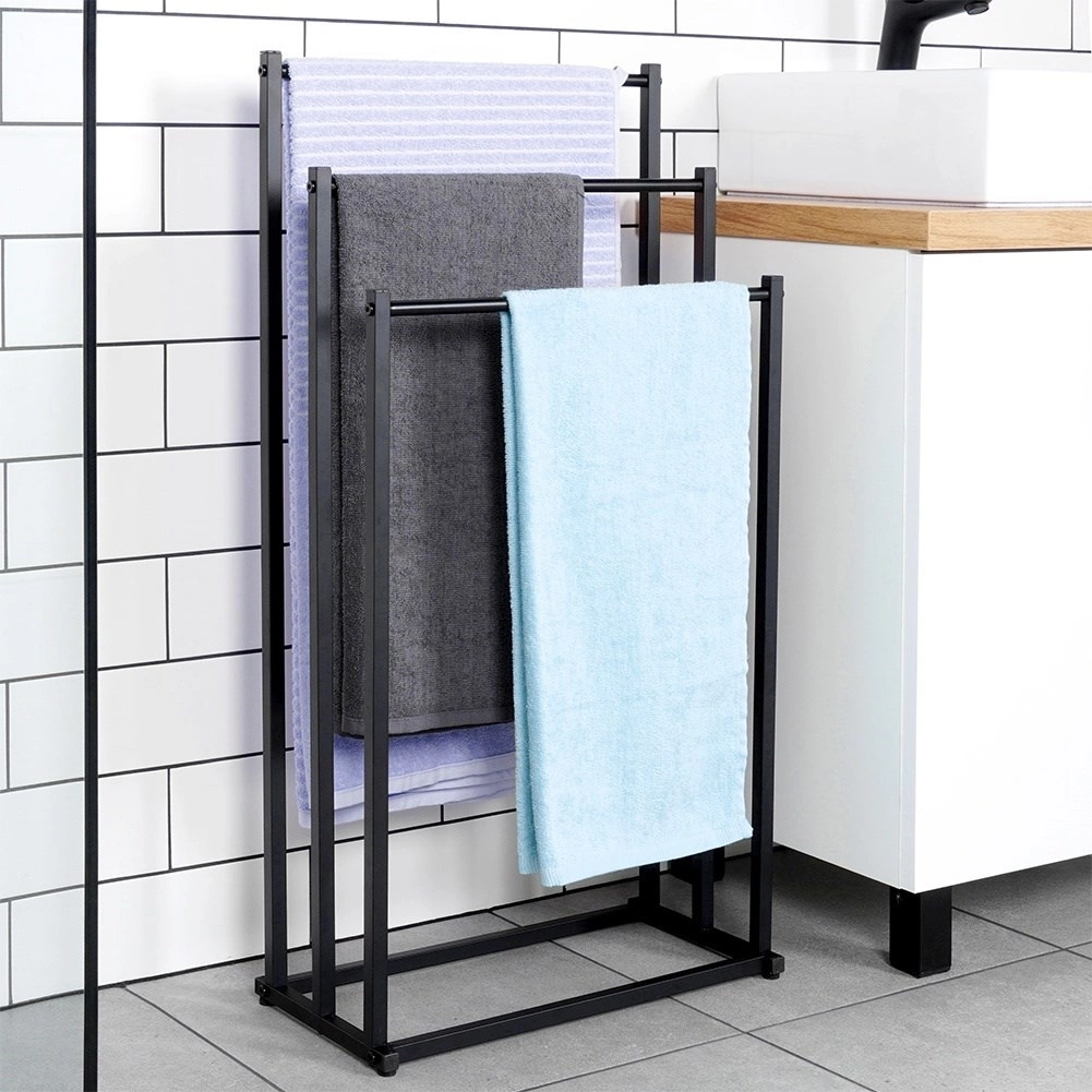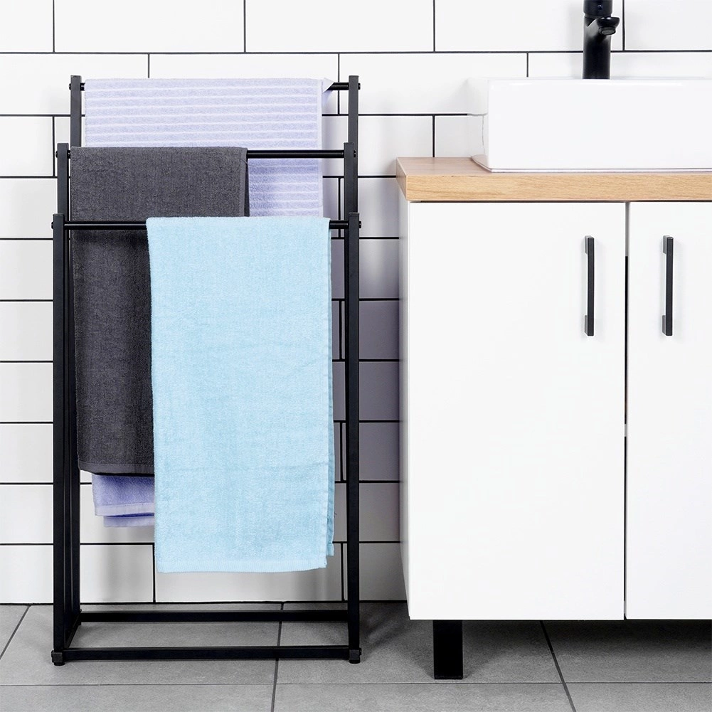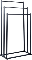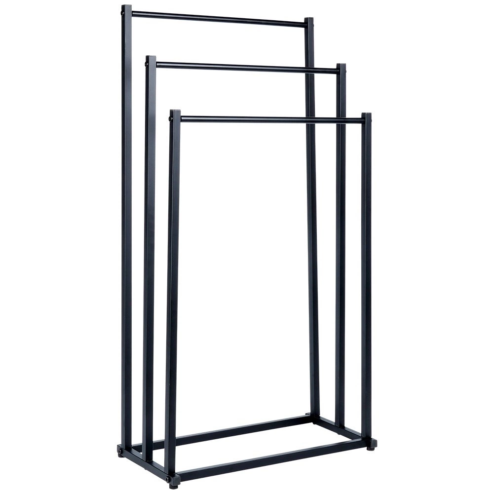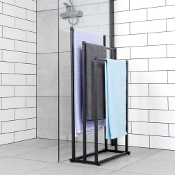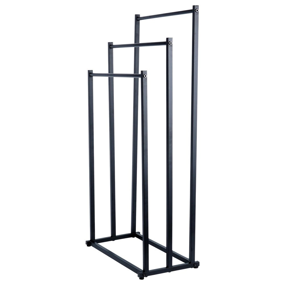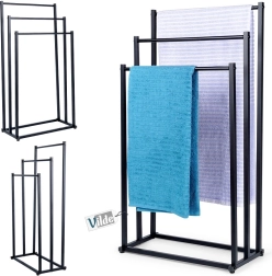 Praktiline vabaltseisev rätikute või rõivaste hoidja kolme astmeliselt paigutatud põiklatiga tagab korrastatud hoiustuse ja parema õhuvahetuse kiirema kuivamise jaoks. Minimalistlik matt must välimus sobitub suurepäraselt modernsete interjööridega ja lisab vannituppa industriaalset iseloomu.