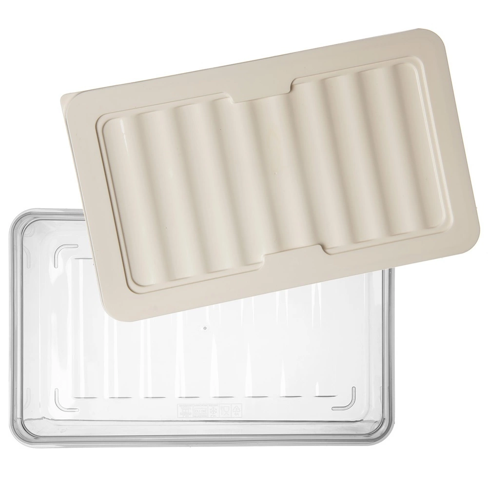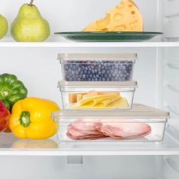 Praktiline madal 1-liitrine toidunõu tihedalt sulguva kaanega kreemikas toonis. Läbipaistev teostus annab sisu üle selge ülevaate, virnastatav kuju säästab ruumi külmikus ning taluvus -25 °C kuni +95 °C võimaldab kasutada sügavkülmas, külmkapis, mikrolaineahjus (ilma kaaneta) ja nõudepesumasinas. Ideaalne juustudele ja lihalõikudele tänu lainelisele põhjale, mis soodustab paremat õhuringlust.