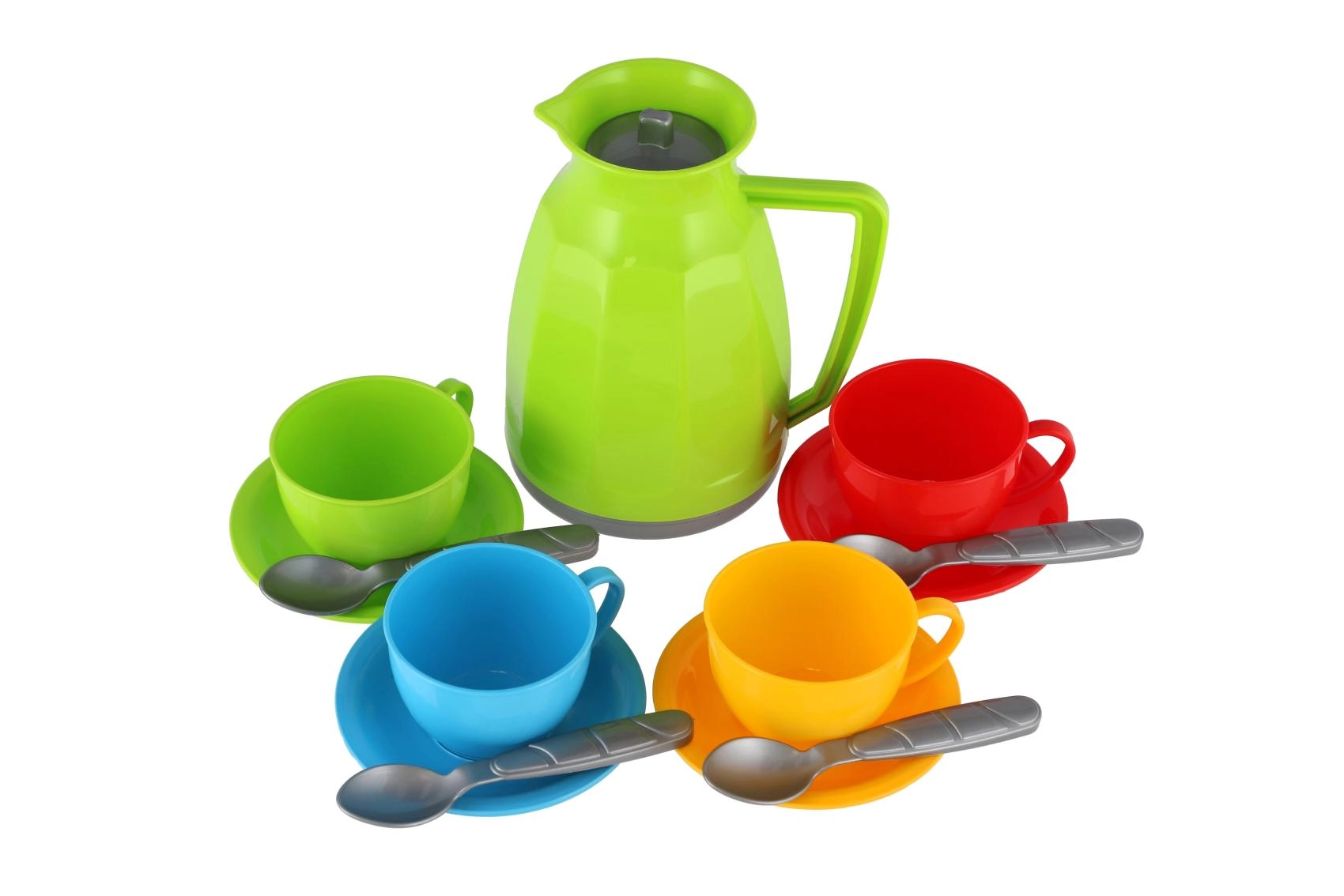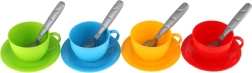 - Teekann, 4 tassi, 4 alustaldrikut, 4 lusikat (värvikombinatsioon)