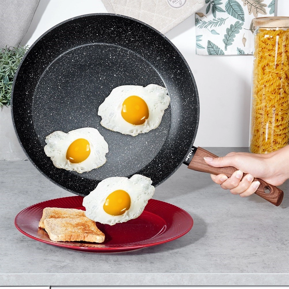 Suur 32 cm läbimõõduga graniitpann, millel on mittekleepuv pind, kiire ja ühtlane soojusjaotus ning ergonoomiline puidu välimusega käepide. Sobib kõigile pliiditüüpidele, sh induktsioon, ning on nõudepesumasinas pestav – ideaalne igapäevaseks praadimiseks ja hautamiseks vähese rasvaga.