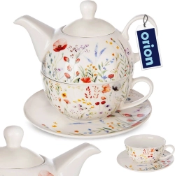 Elegantne portselanist tea-for-one komplekt ühele teearmastajale ühendab teekannu 400 ml, tassi 280 ml ja taldriku kompaktses virnastatavas disainis. Valget portselani kaunistavad värvilised põllulilled, teekannul on praktiline kaas, mis hoiab temperatuuri ja kaitseb jooki. Sobib nõudepesumasinasse ja mikrolaineahju – suurepärane ka stiilse kingitusena.