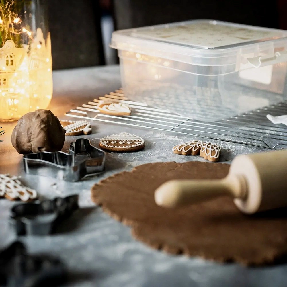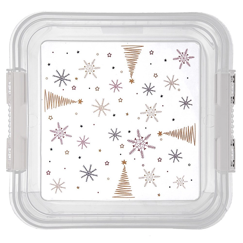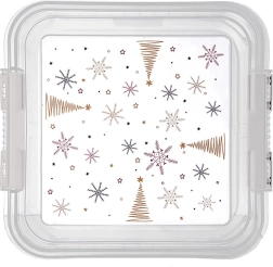 Praktiline ja vastupidav karp igapäevaseks kasutamiseks köögis ja kodus. Läbipaistvad seinad võimaldavad sisu kohest kontrolli ilma avamata, samas kui turvaliste klambritega kaas hoiab kõik värske ja kaitstuna. Pühade teemaline tähtede ja kuuskede trükk rõõmustab eriti jõuluajal.