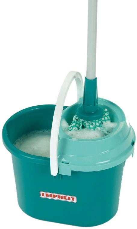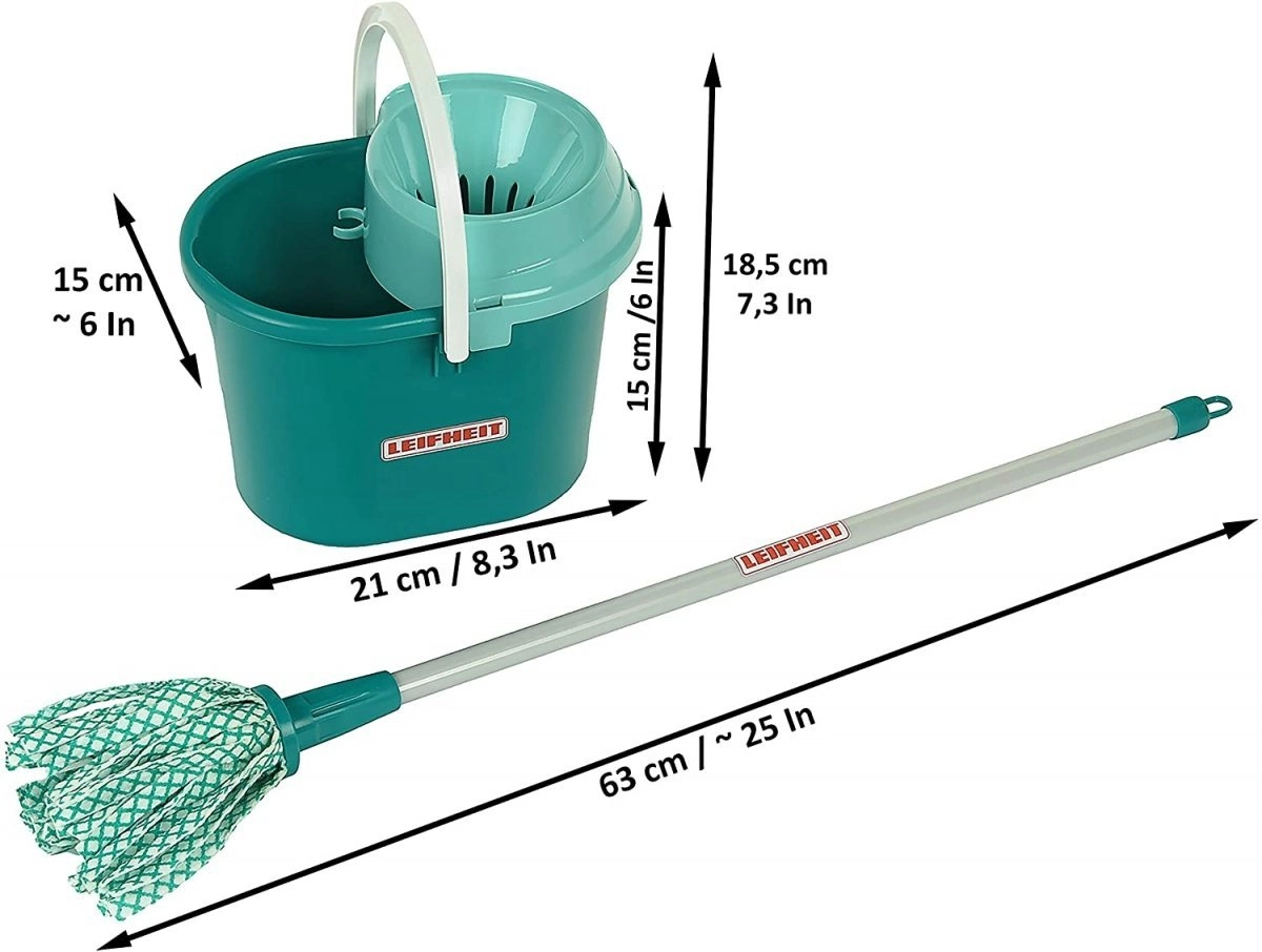 Realistlik komplekt väikestele koduabilistele: laste ämber eemaldatava väänajaga ja ribaseline mop LEIFHEIT litsentsi all kaubamärgilt KLEIN. Sobib täiskasvanute jäljendamiseks, valmistatud vastupidavatest materjalidest ning seda saab kasutada ka veega veelgi ehtsama mängukogemuse jaoks.