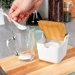 See kompaktne suhkrutoos (9,5 × 9,5 × 9 cm) on valmistatud vastupidavast valgest keraamikast ning varustatud volditava bambuskaanega, mis kaitseb sisu niiskuse ja tolmu eest. Komplektis on sobiv keraamiline lusikas (13 cm) koos nutika hoiukohaga, et see oleks alati käepärast.