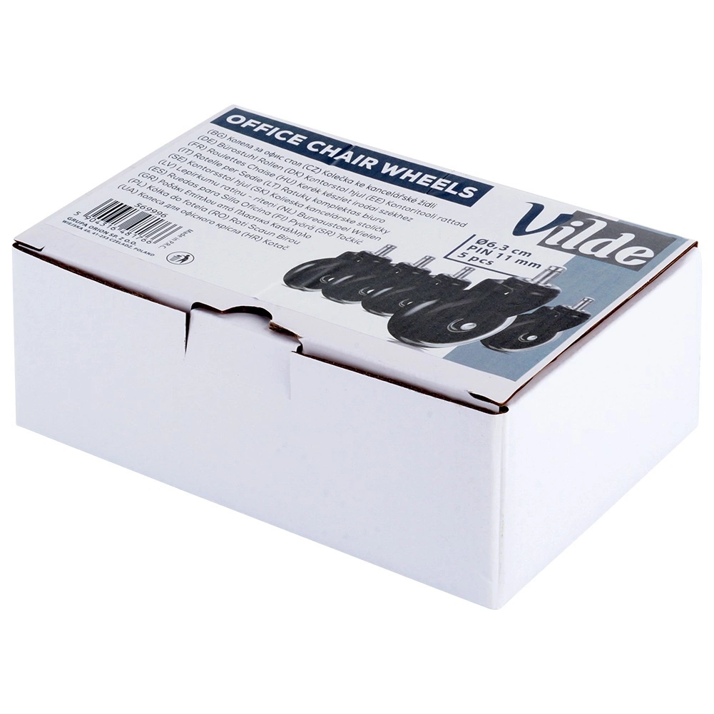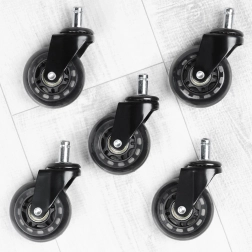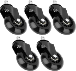 Viie varuratta komplekt kontoritoolile, rattad läbimõõduga 63 mm ja tift 11 mm. Tagavad vaikse ja sujuva liikumise, põranda kaitse kriimustuste eest ning tööriistadeta kiire paigalduse. Universaalne suurus ühildub enamiku toolidega (ei sobi IKEA mudelitele).