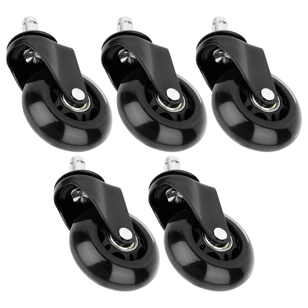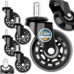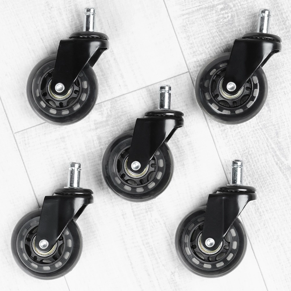 Täiendage oma kontoritooli 5 kummist rattaga, mis tagavad vaikse ja sujuva liikumise kõigil kõvadel põrandatel. Tänu vastupidavale materjalile on rattad kulumiskindlad ja õrnad pindadele, nii et te ei pea kartma põrandakriimustusi ei kontoris ega kodus.