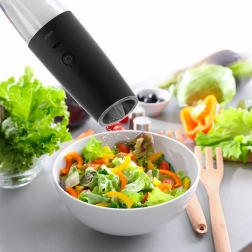 Nauti värskelt jahvatatud maitseaineid ühe käeliigutusega. Laetava akuga elektriline veski käivitub automaatselt siis, kui pöörad selle põhjaga üles, ning keraamiline mehhanism saab hakkama ka kõvemate teradega. Läbipaistev mahuti võimaldab hõlpsalt jälgida kogust ning elegantne must viimistlus sobitub suurepäraselt nii köögitasapinnale kui ka lauale.