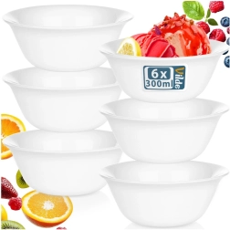 6 valgest opal klaasist kausi komplekt ühendab portselani meenutava elegantse välimuse ja igapäevaseks kasutamiseks vajaliku vastupidavuse. Iga kausi maht on 300 ml ning mõõtmed ligikaudu 13 × 13 × 5 cm, mistõttu need sobivad suurepäraselt väikeste suupistete, magustoitude või suppide serveerimiseks.