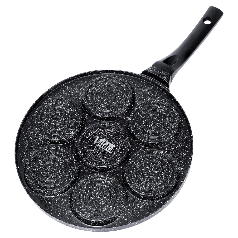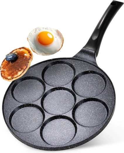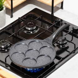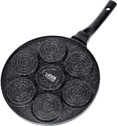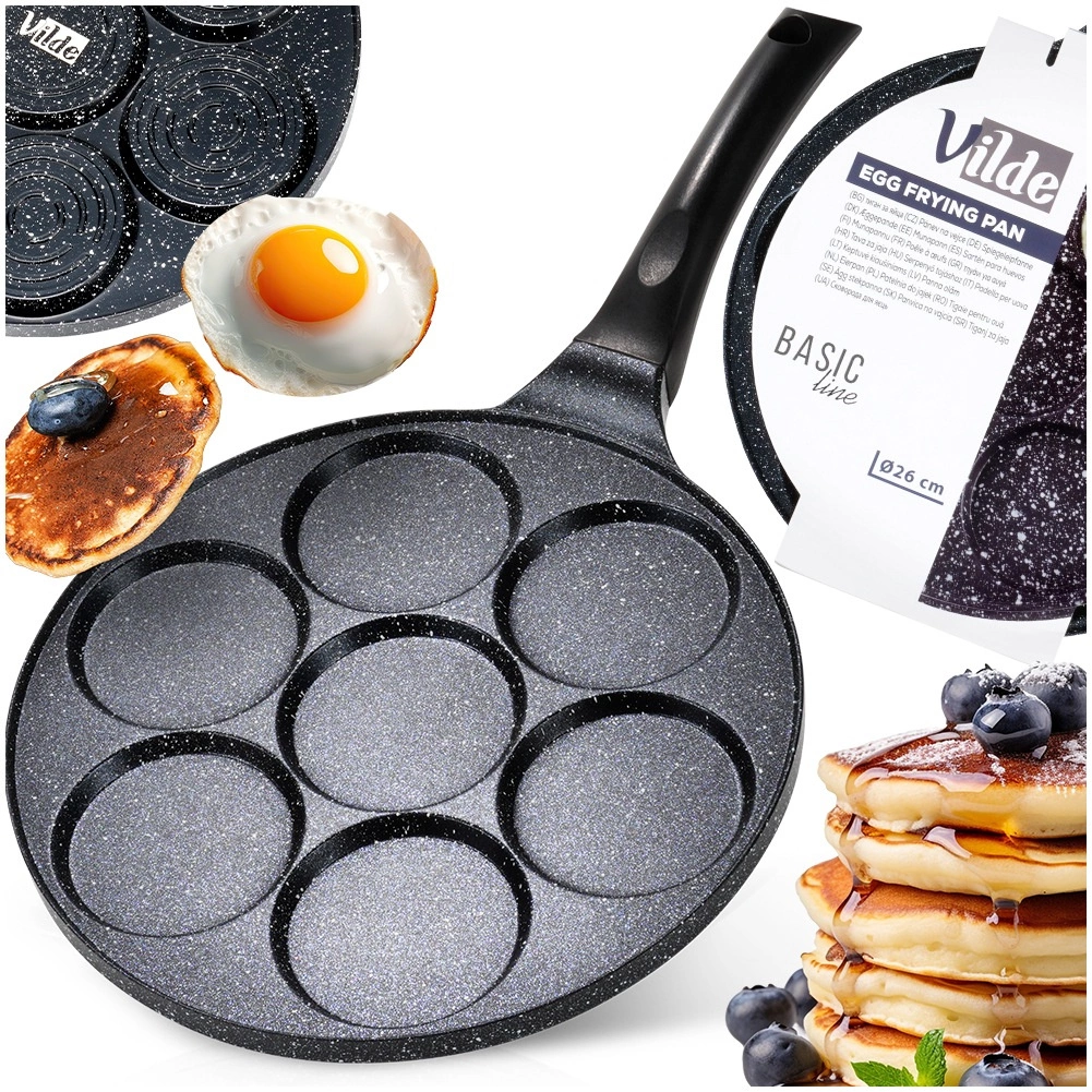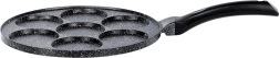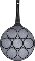 Praktiline graniitpann 7 ümmarguse avaga (Ø 8 cm) täiuslikult vormitud munade, pliinide ja mini-pannkookide jaoks. Kerge alumiiniumkere mittenakkuva pinnaga vähese rasvaga küpsetamiseks, ühtlane soojusjaotus ja ergonoomiline käepide riputusaasaga. Sobib gaasi-, elektri- ja keraamilistele pliitidele ning nõudepesumasinasse.