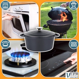 Sobib gaasile, elektrile, keraamilisele klaasile, halogeenile ja induktsioonile. Talub kõrgeid temperatuure ahjus ja grillil.