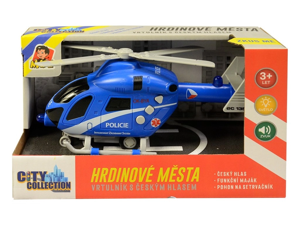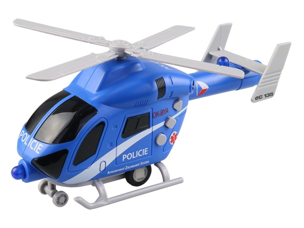 Realistlik politseihelikopter Tšehhi kujundusega rõõmustab lapsi alates 3. eluaastast. Pakub valgus- ja heliefekte, toimivat vilkurit ning tšehhikeelseid dispetšeri ja piloodi lauseid. Tänu hoorattale hakkab kergesti liikuma ja toob palju põnevat mängurõõmu.