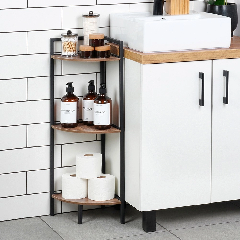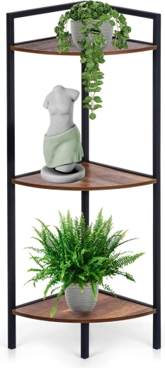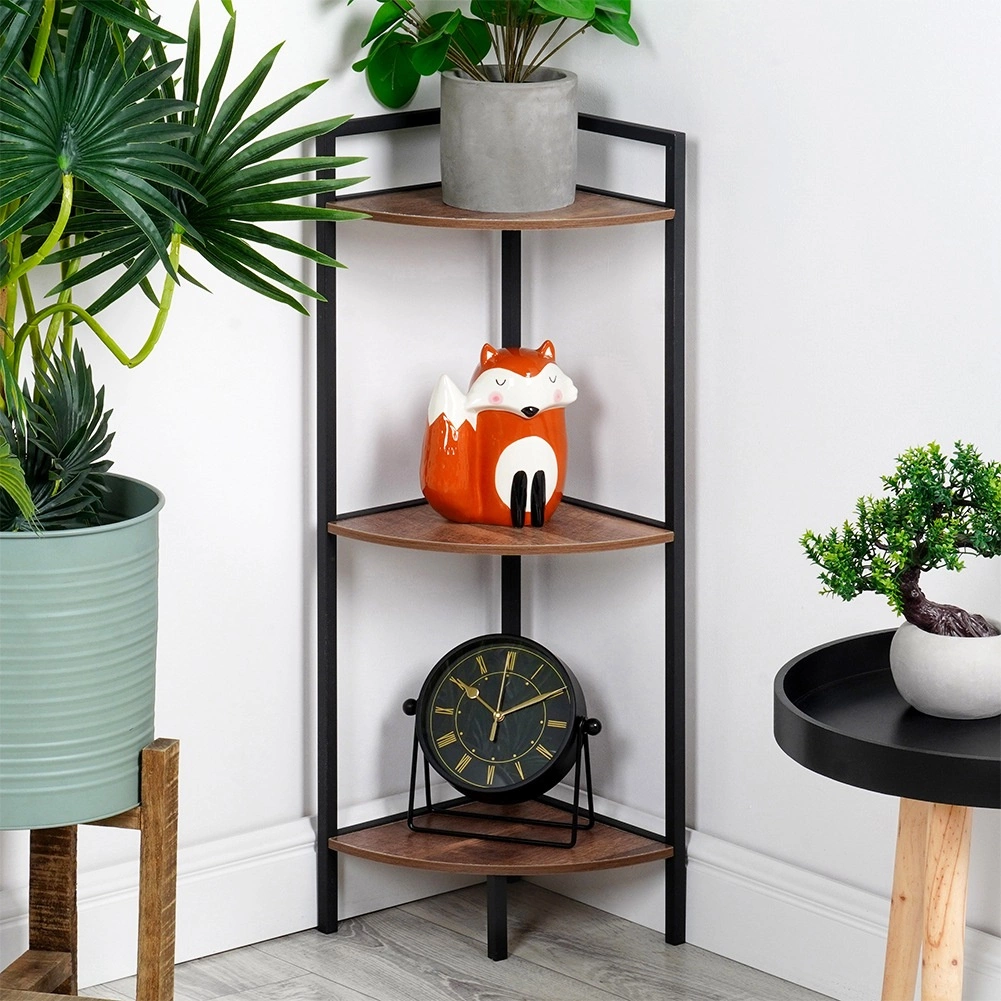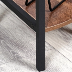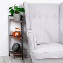 Nurgariiul mõõtudega 23,5 × 23,5 × 76 cm on nutikas lahendus nii väiksematesse kui ka suurematesse ruumidesse. Minimalistlik disain musta metalli ja puiduimitatsiooniga loob õhulise, modernse ilme, samas kui kolm avarat riiulit tagavad ülevaatliku hoiustamise ja stiilse lemmikesemete esitlemise.