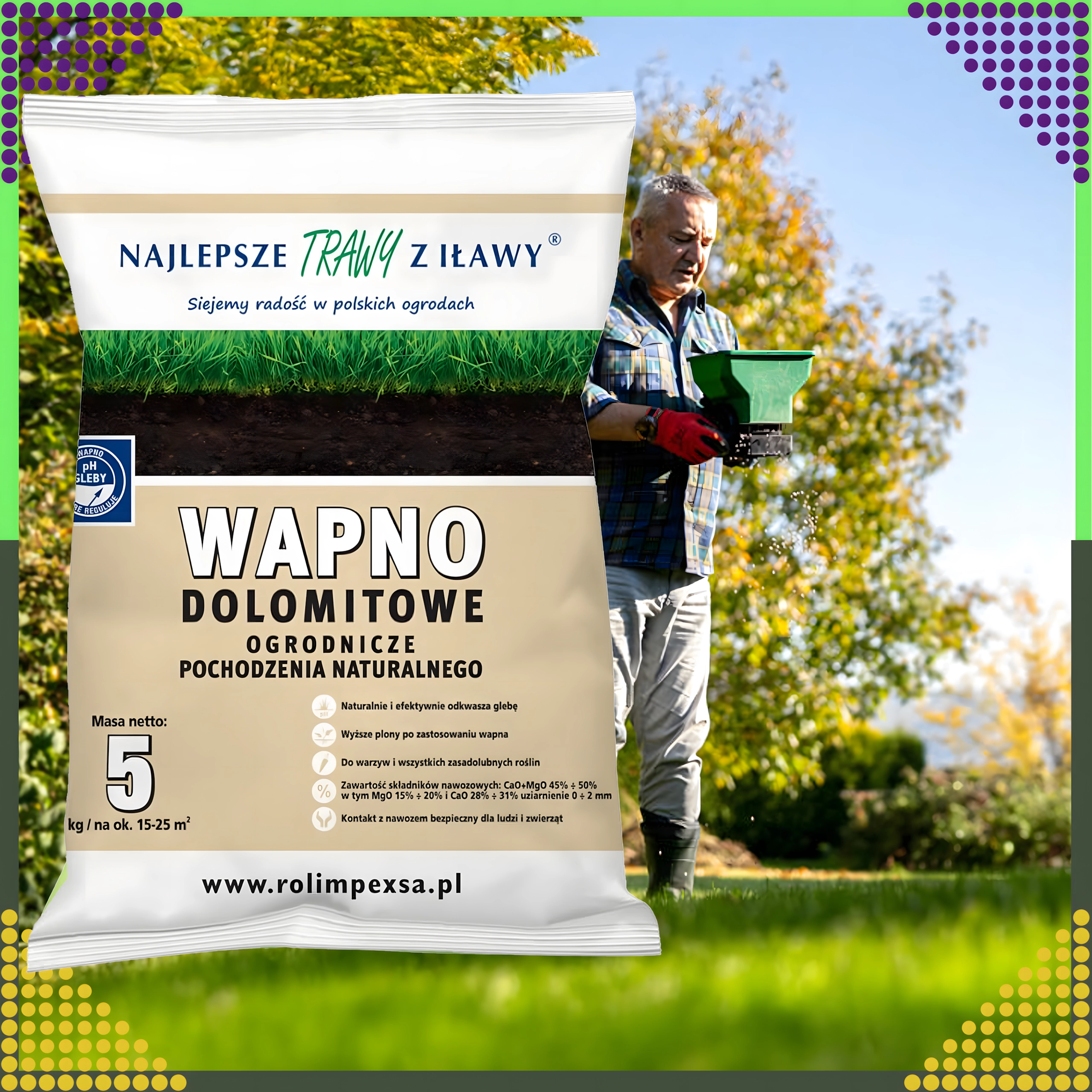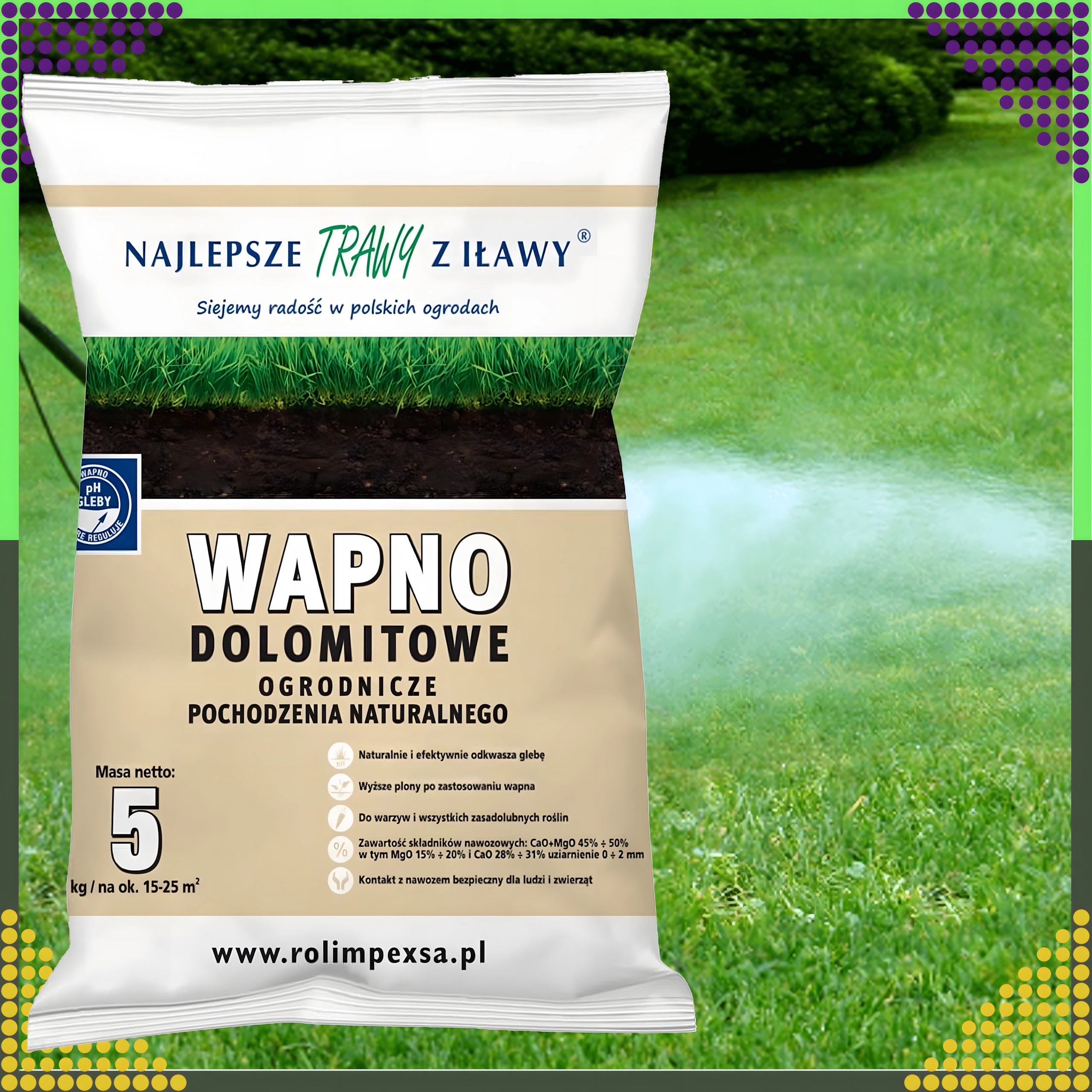 Suurendage mulla viljakust ja elujõulisust loodusliku dolomiidilubja abil praktilises 5 kg pakendis. See ökoloogiline magneesiumirikas toode vähendab tõhusalt mulla happesust, parandab selle keemilist ja füüsikalist struktuuri ning varustab samal ajal oluliste mikroelementidega tervislikuks taimede kasvuks.