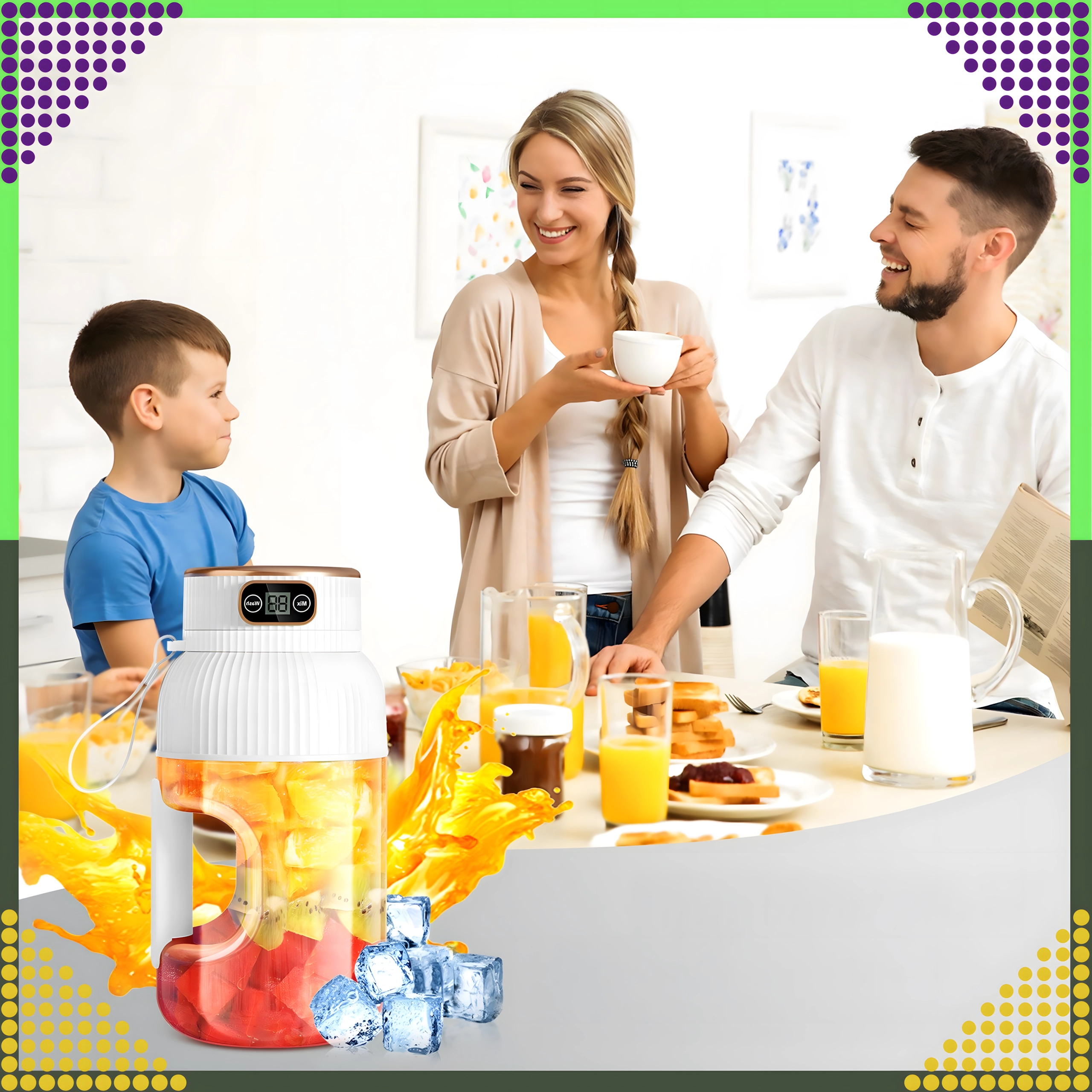 Integreeritud ekraan kuvab segamisrežiimi ja aku taset. Mugav käepide ja kerge konstruktsioon teevad kandmise lihtsaks.