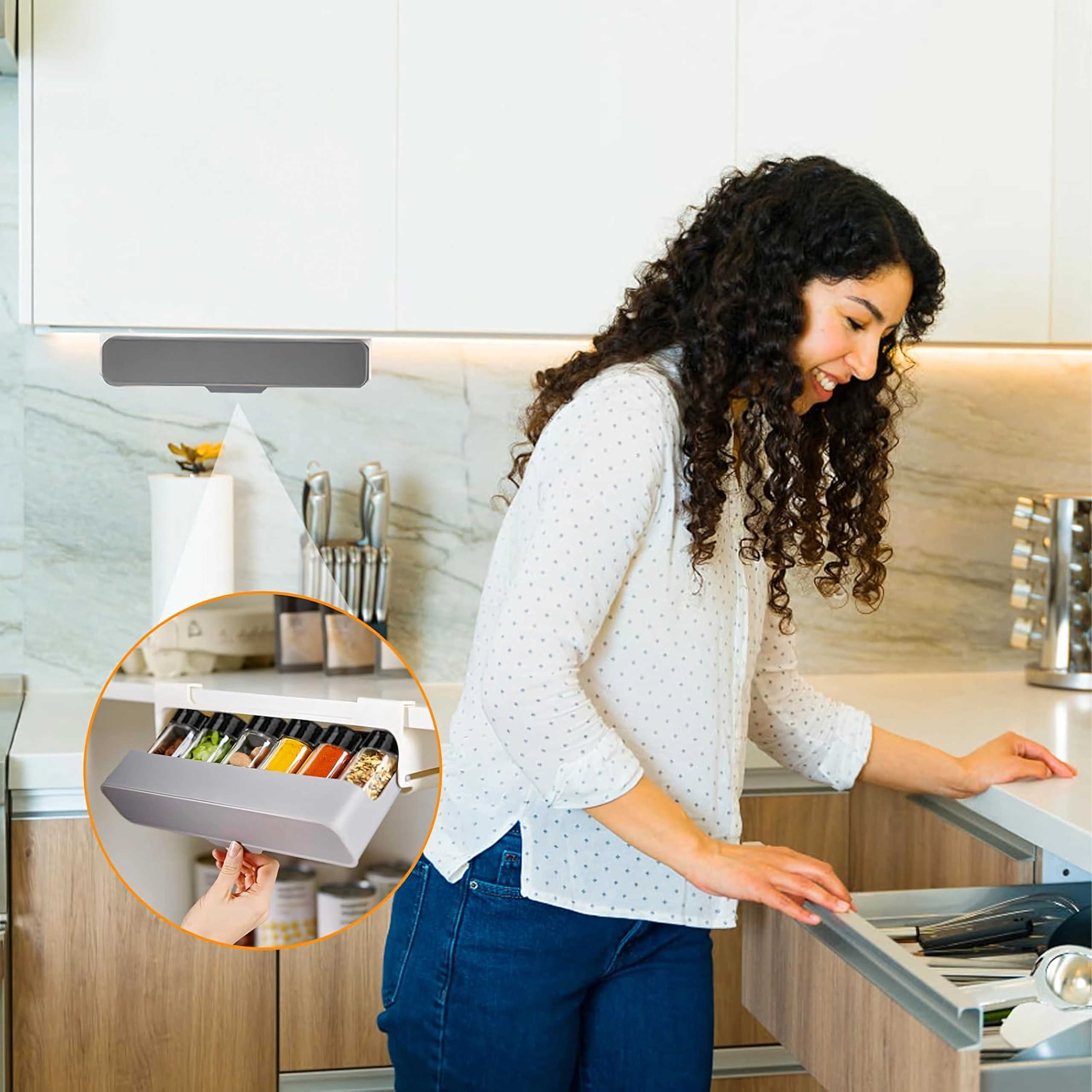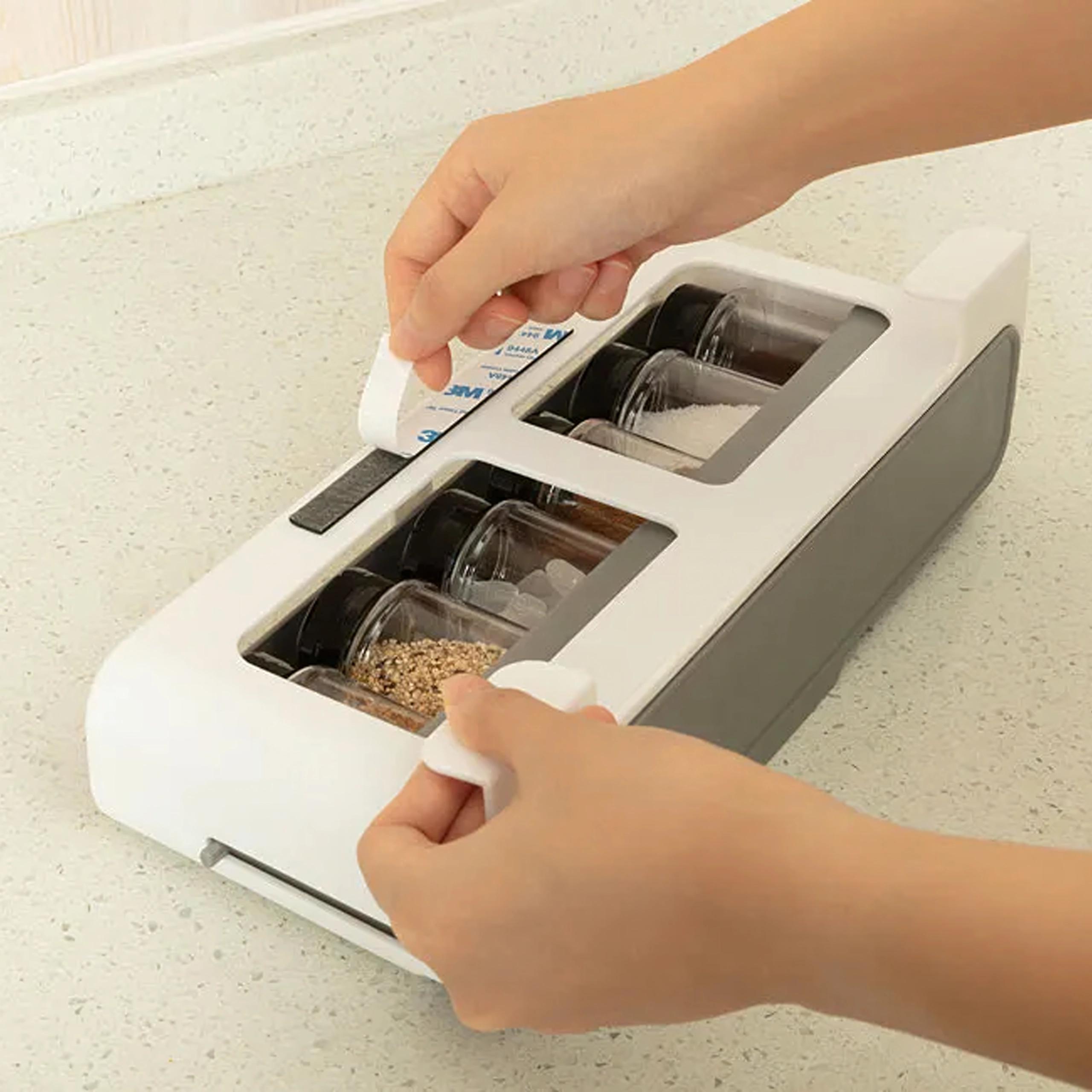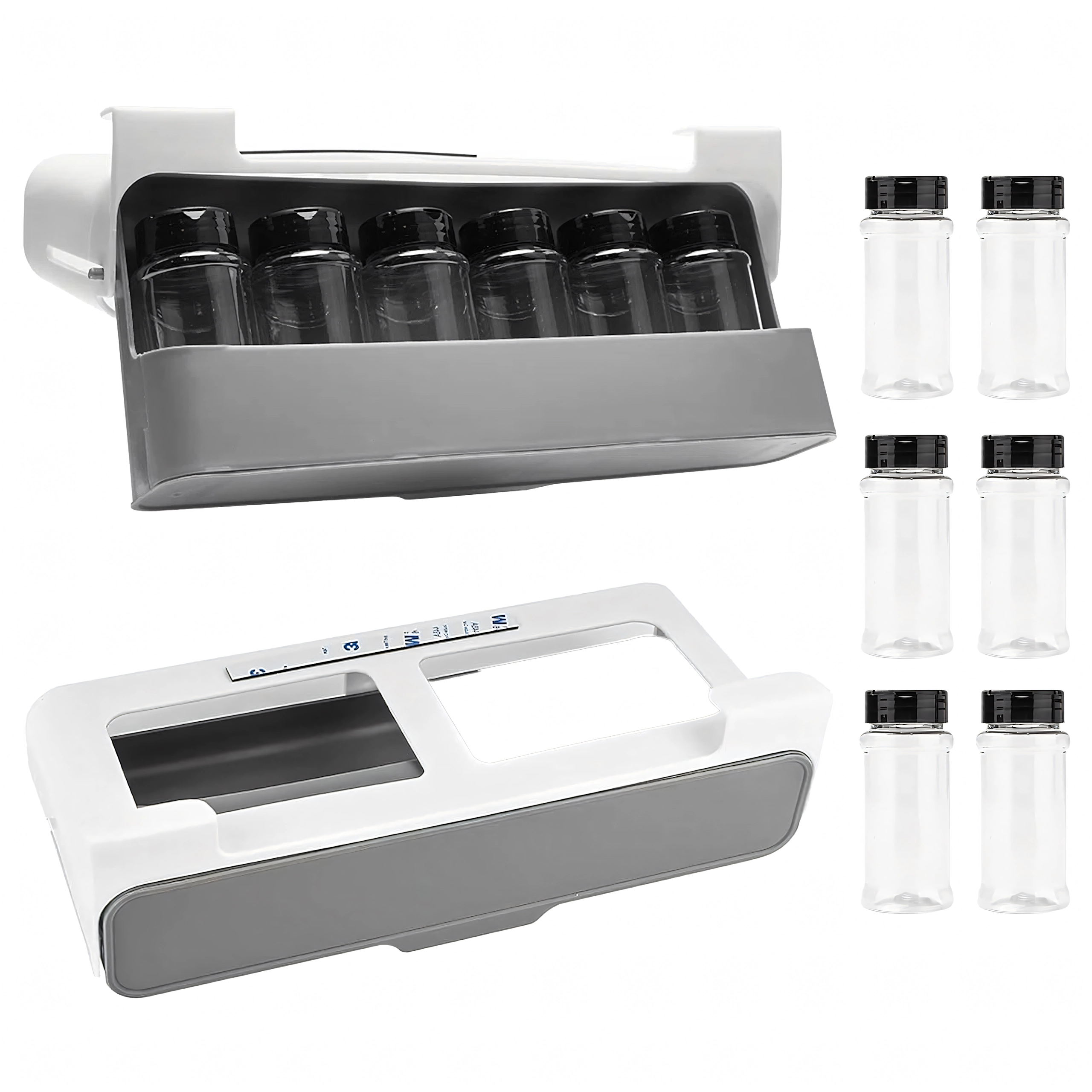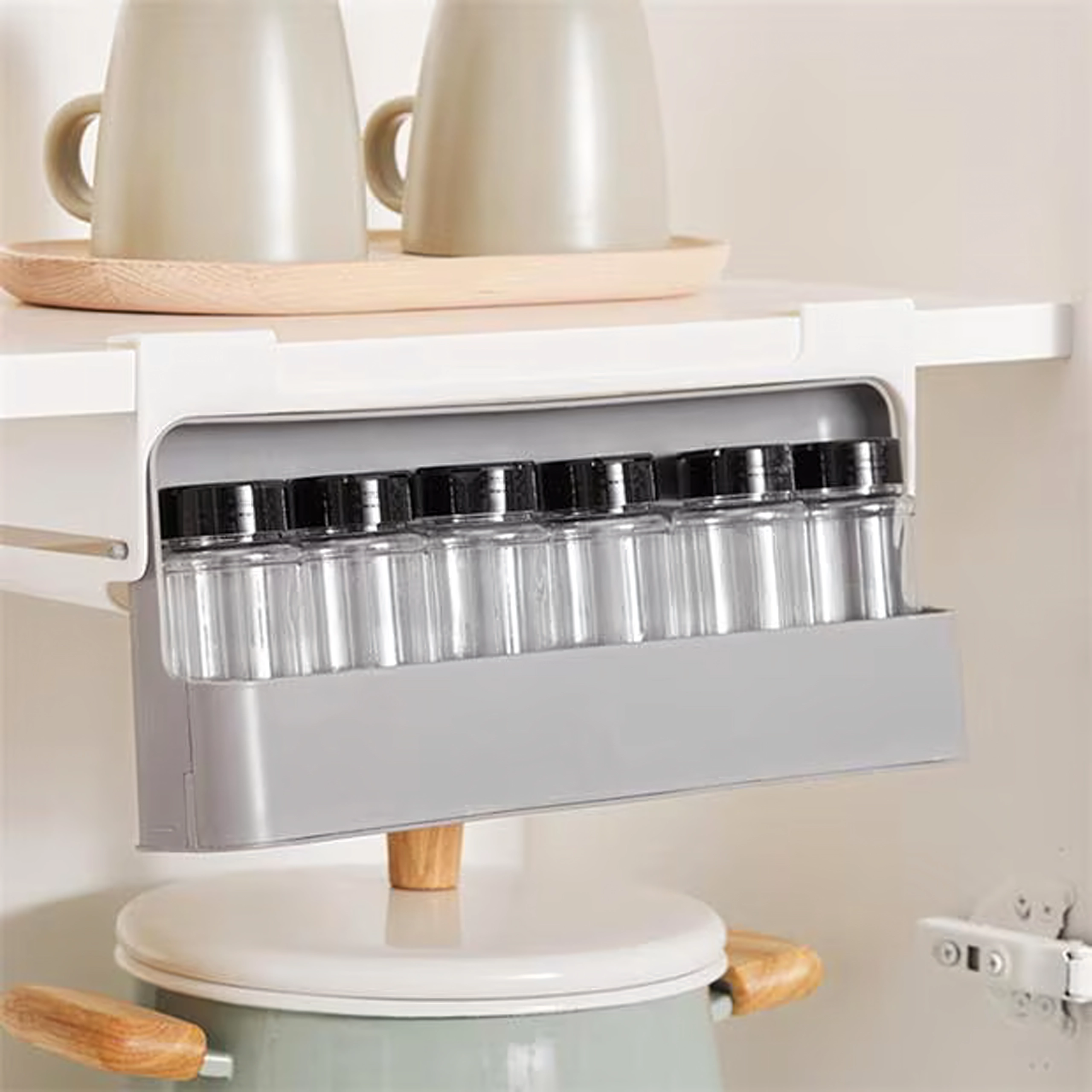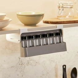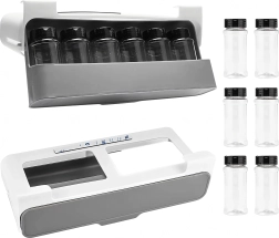 Hoia köök korras ja säästa ruumi sahtlisse paigaldatava maitseainete korraldajaga, millel on 6 läbipaistvat purki ja mis kinnitub ilma puurimiseta 3M isekleepuva teibiga. Kiire juurdepääs, kompaktne disain ja sobivus enamiku riiulite ja kappidega teevad sellest korraldajast suurepärase valiku igasse kööki.