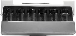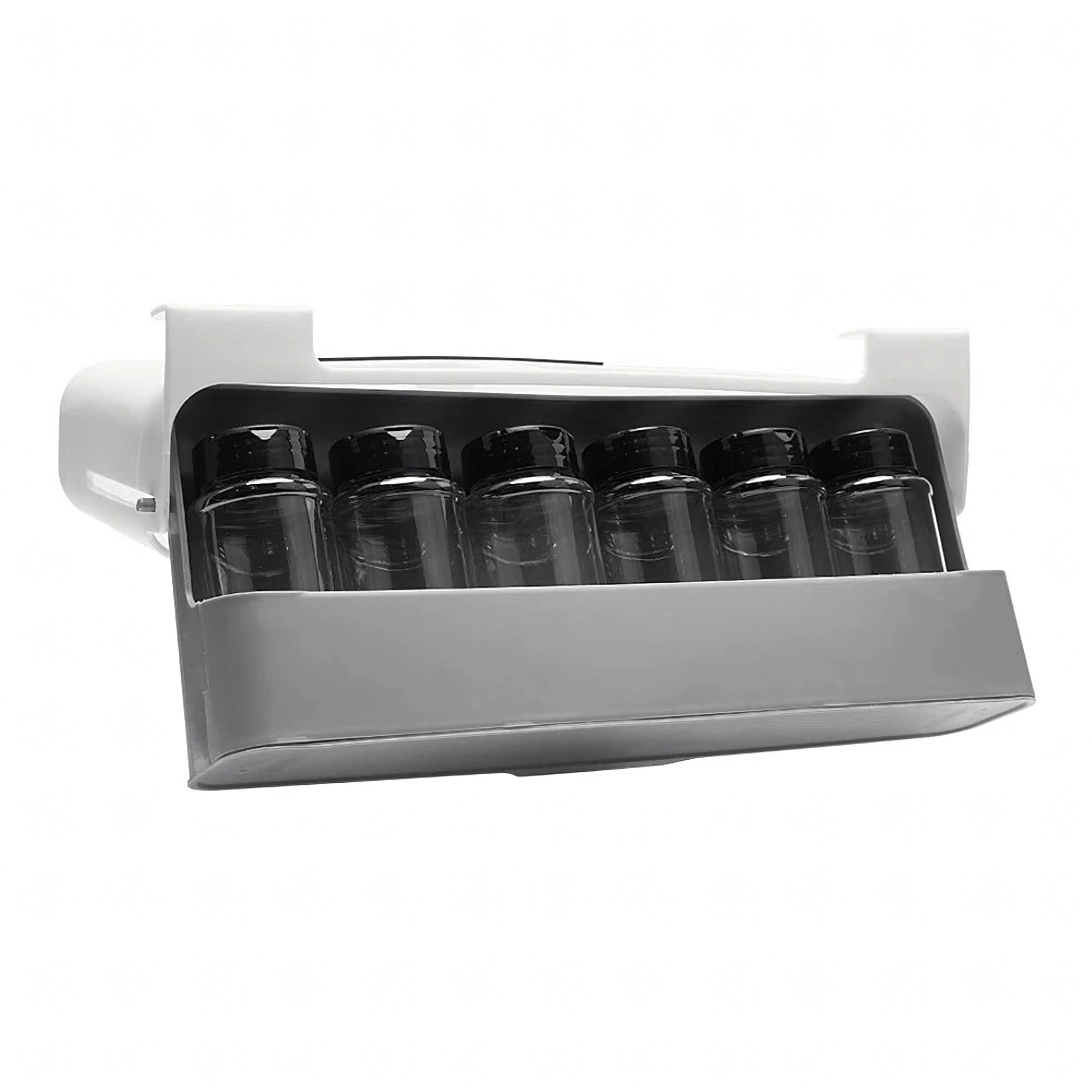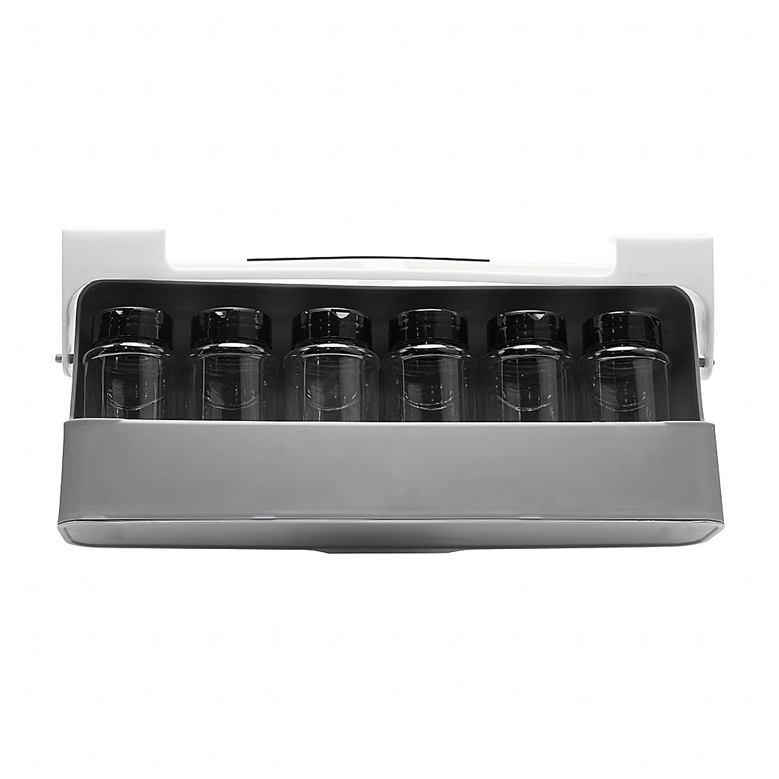 Kuus läbipaistvat klaasanumat mustade kaantega hoiavad maitseained värsked ja puhtad. Minimalistlik valge-halli tooniga teostus sobib nii modernsetesse kui klassikalistesse köökidesse ning kasutab tõhusalt ära ruumi riiuli all või kapis.