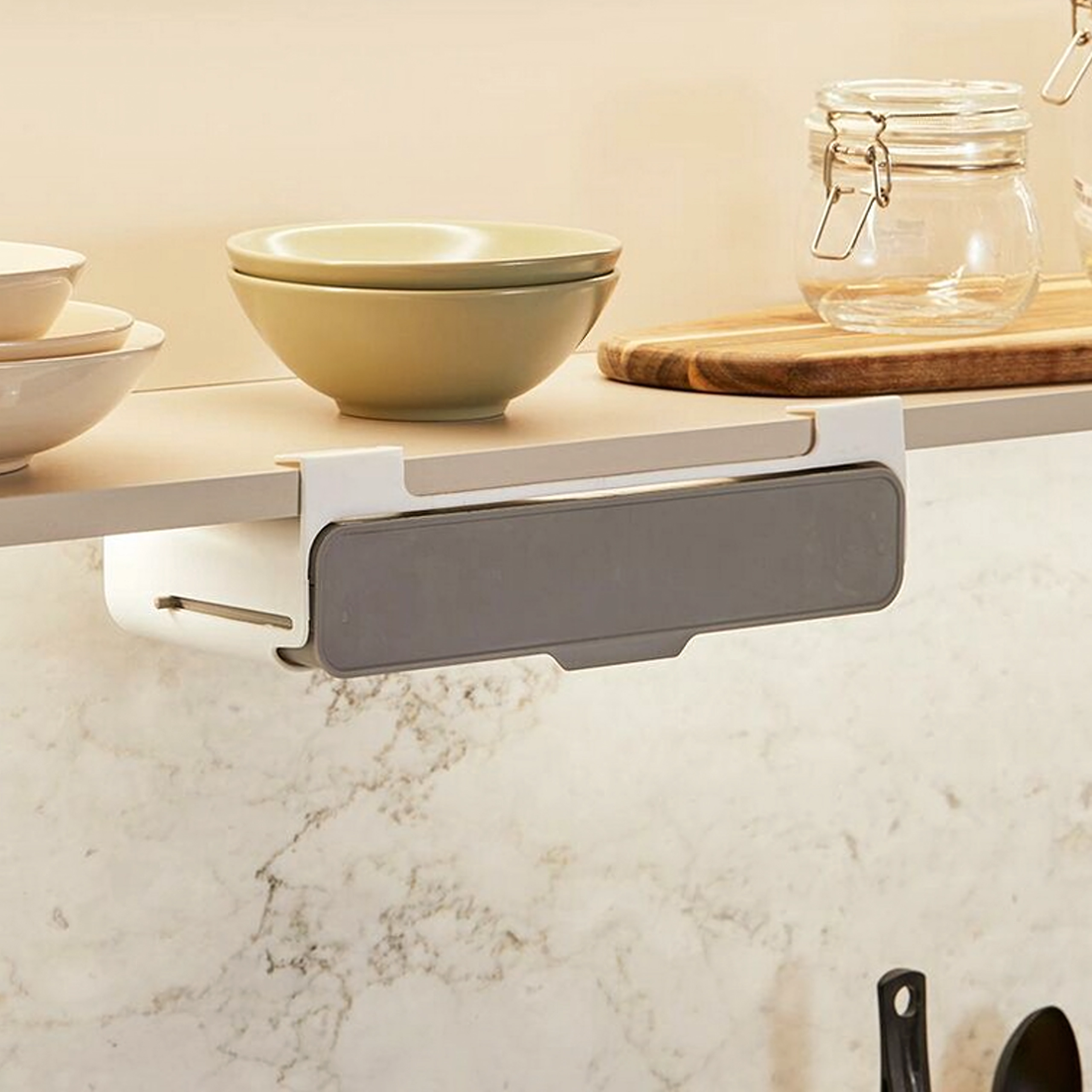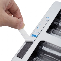 Tugev 3M isekleepuv teip hoiab korraldajat kindlalt riiuli all või kapis. Paigaldamine võtab vaid mõned minutid ning ei vaja tööriistu ega puurimist.