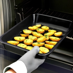 Tänu kõrgetele servadele sobib suurepäraselt mahlasele lihale, vormiroogadele, täidisega pirukatele ja kartulitele – ilma ülevoolu riskita. Universaalne mõõt sobib enamikele koduahjudele ja pakub usaldusväärset tulemust igapäevaseks küpsetamiseks.