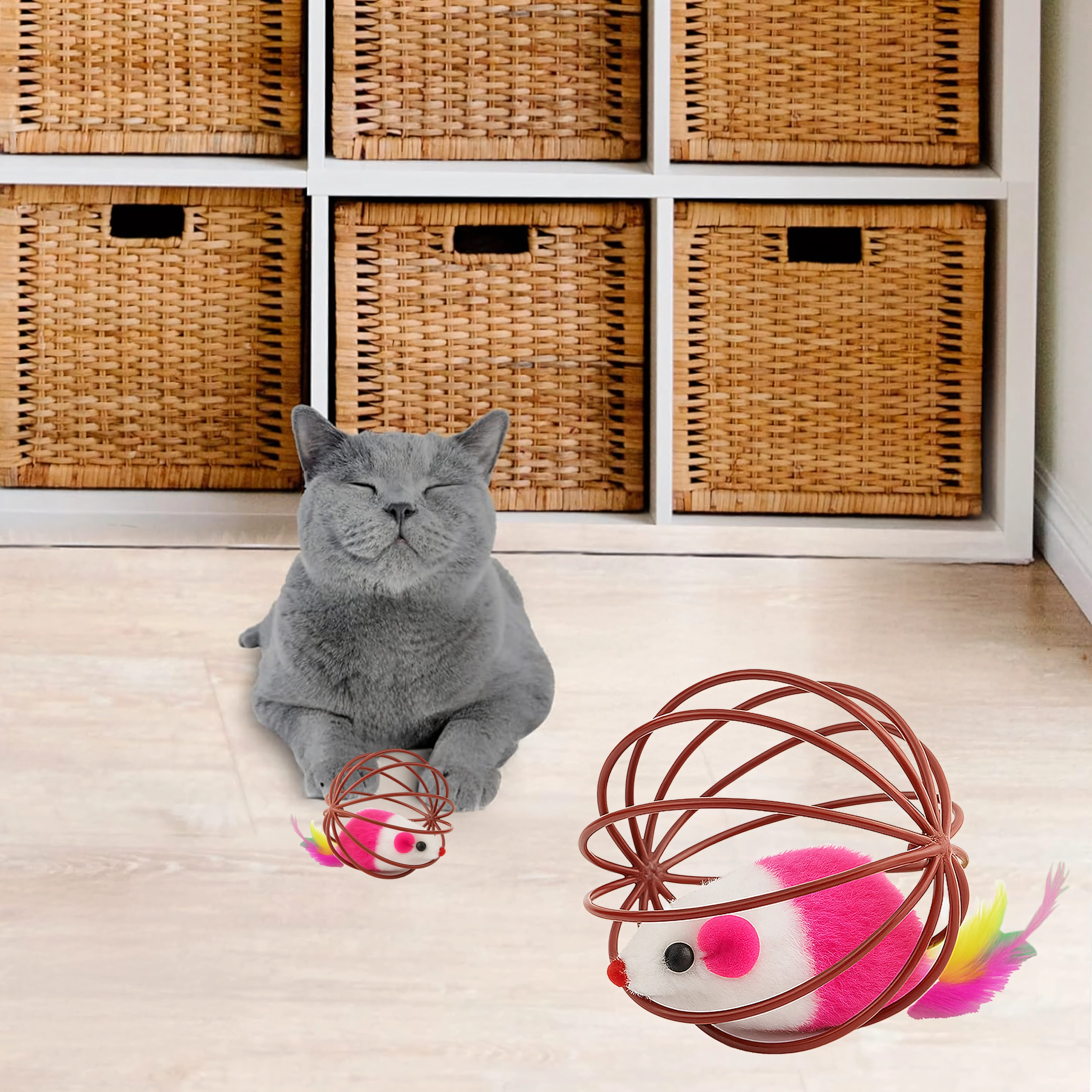 Tänu vastupidavale traadist konstruktsioonile veereb mänguasi kergesti, kuid hiir püsib turvaliselt sees. Avatud struktuur võimaldab kassil mänguasja hästi haarata ja lükata, samas kui pehme plüüss ja suled pakuvad köitvaid tekstuure. Suurepärane valik iseseisvaks ja interaktiivseks mänguks koos omanikuga.