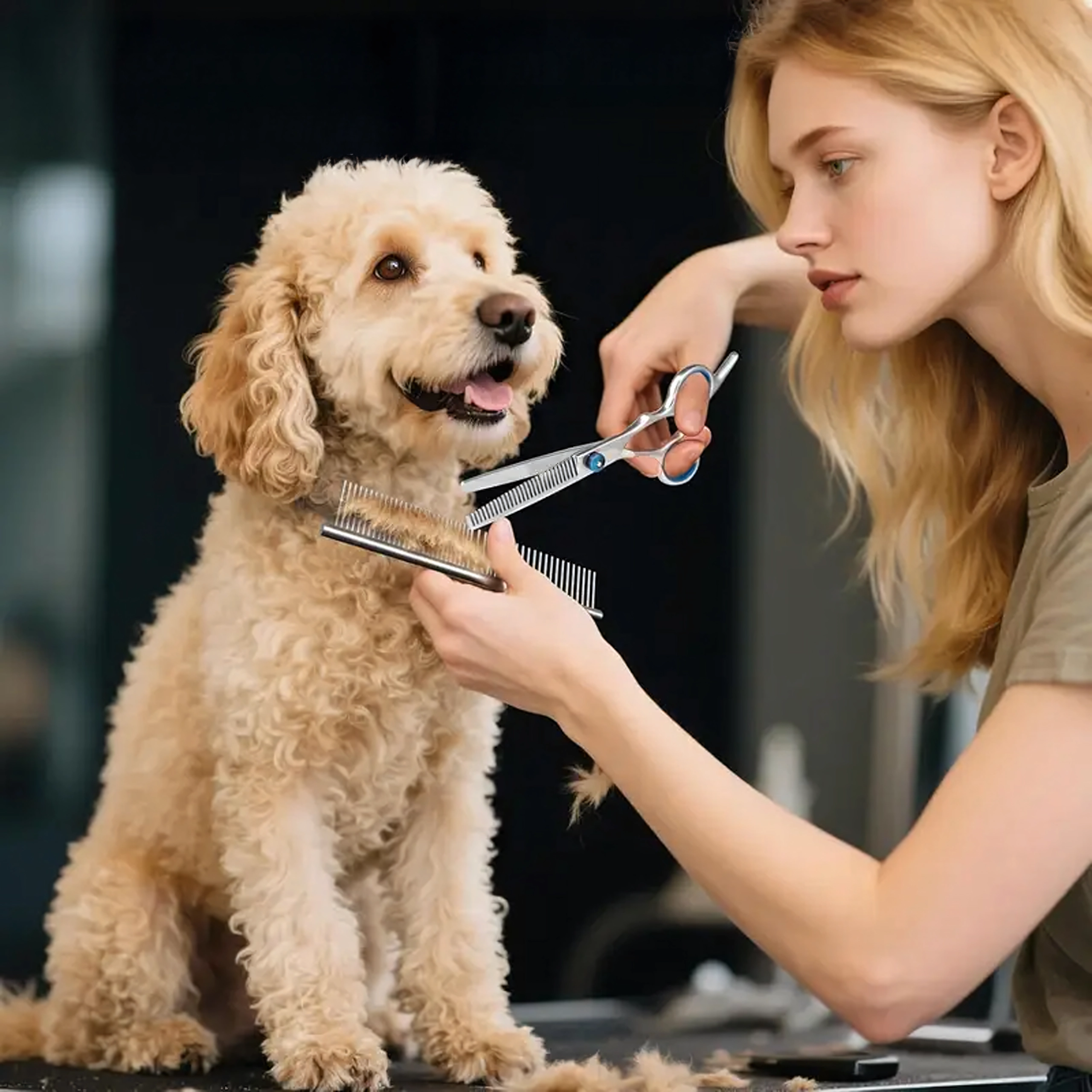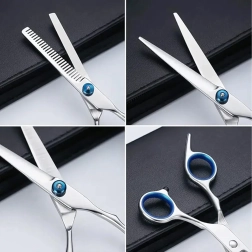 See universaalne groomingukomplekt on loodud täpseks vormimiseks, harvendamiseks ja viimistluseks koerte ning kasside karvahooldusel. Roostevaba teras tagab pika tööea, puhta lõike ja lihtsa hoolduse. Tänu ergonoomilistele sõrmerõngastele ja toele on töö mugav ka pikema kasutuse korral.