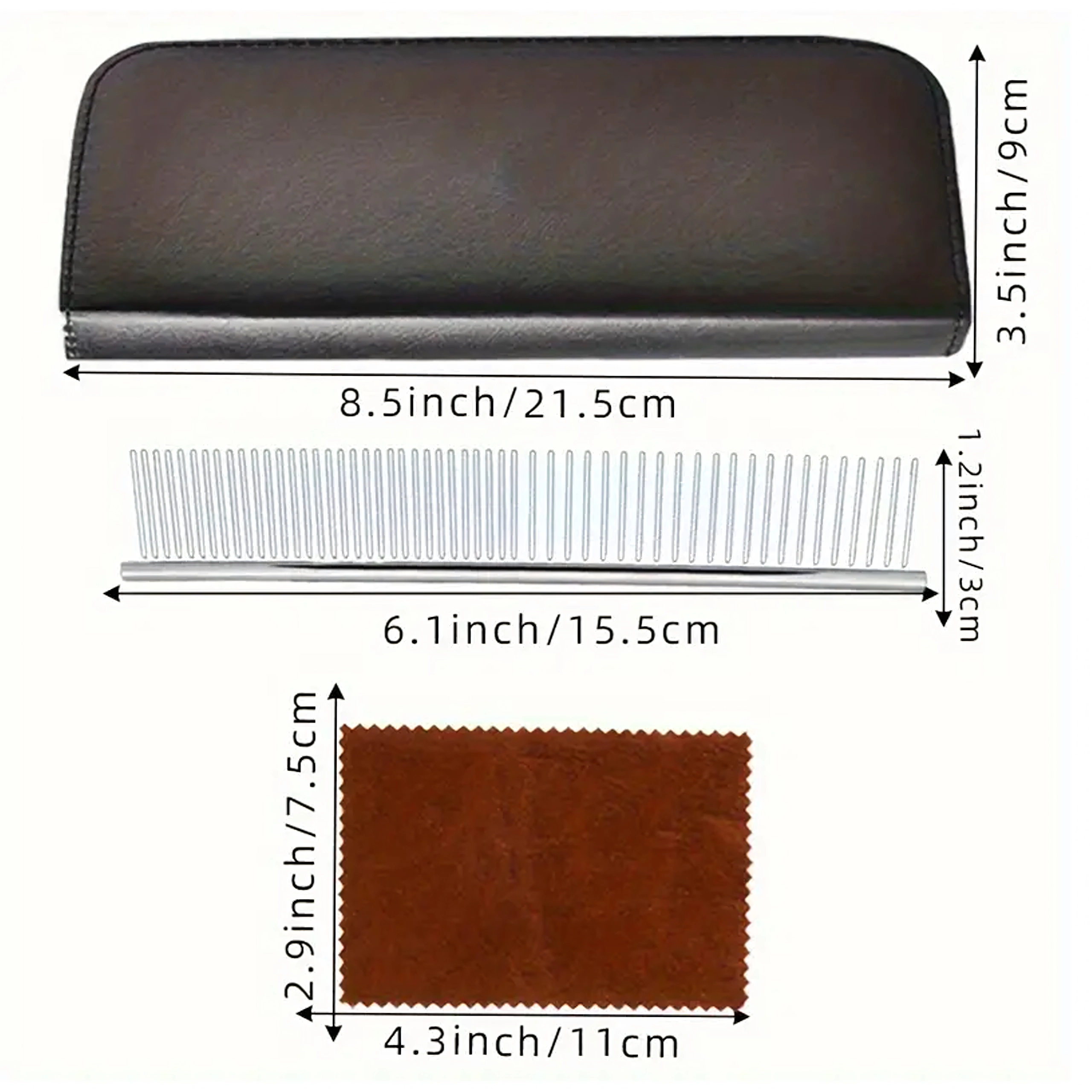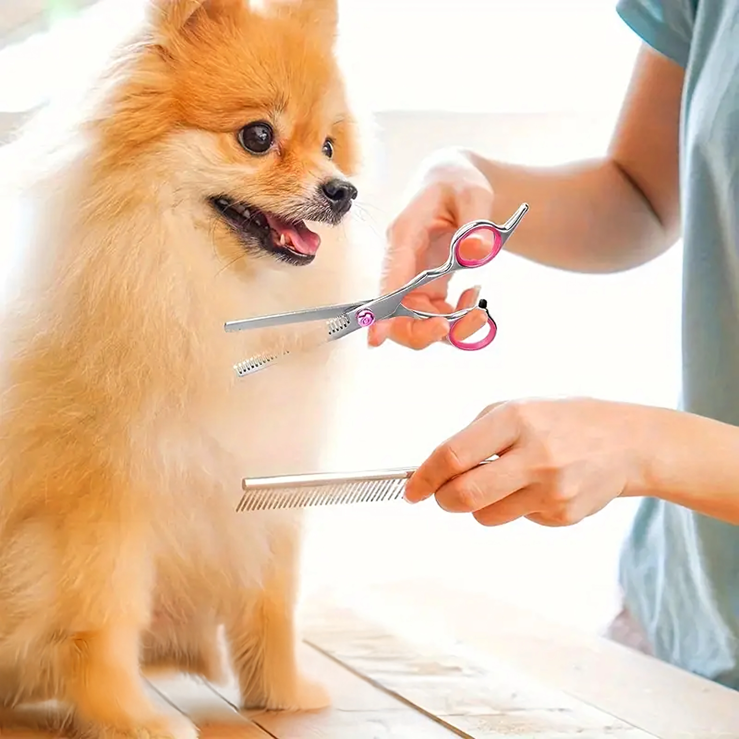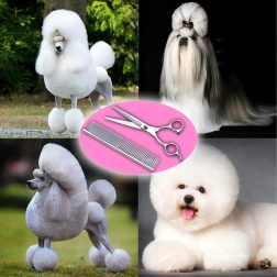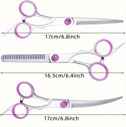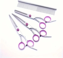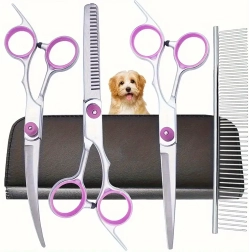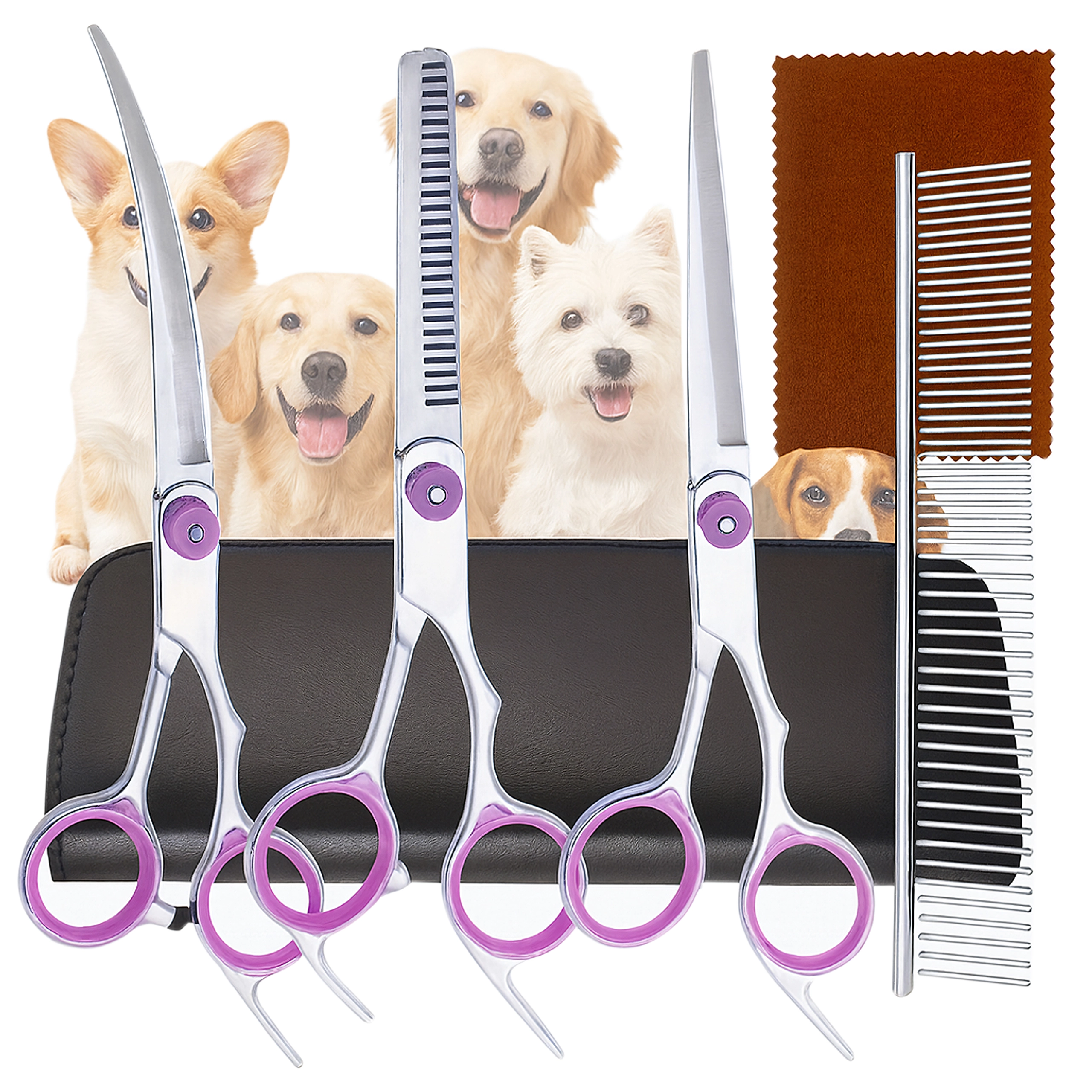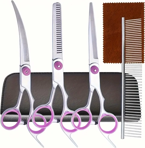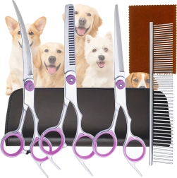 Täielik lemmikloomade karvahoolduskomplekt sisaldab sirgeid, kumeraid ja efilaatori (harvendus) kääre, metallkammi ja elegantset vutlarit. Valmistatud roostevabast terasest täpseks, ohutuks ja mugavaks lõikamiseks nii kodus kui ka groomingu salongis.