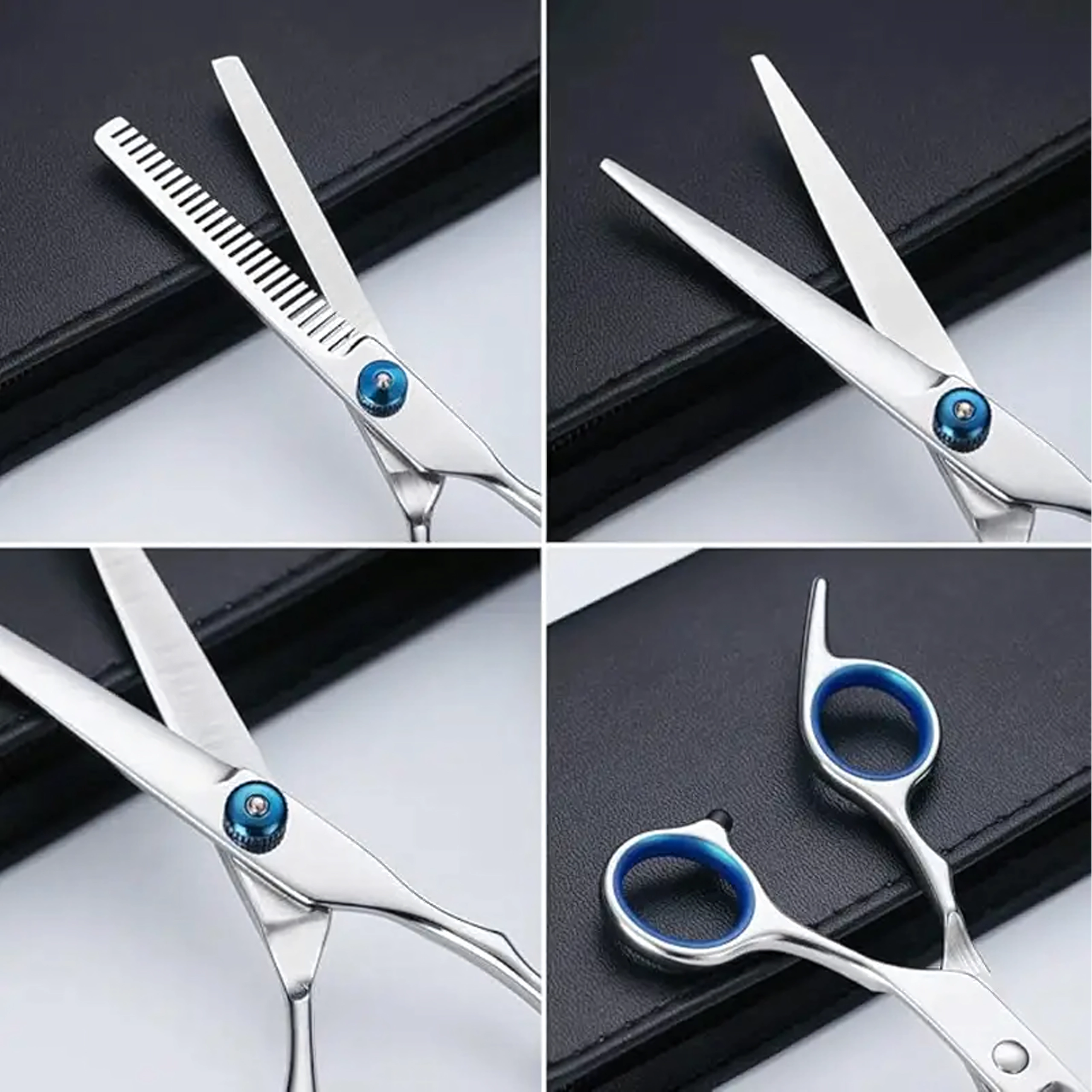 Kolm kääritüüpi (sirged, kumerad, efilaator) + metallkamm kaitsvas vutlaris. Kõik ühes kohas lõikamiseks, vormimiseks ja karva harvendamiseks.
