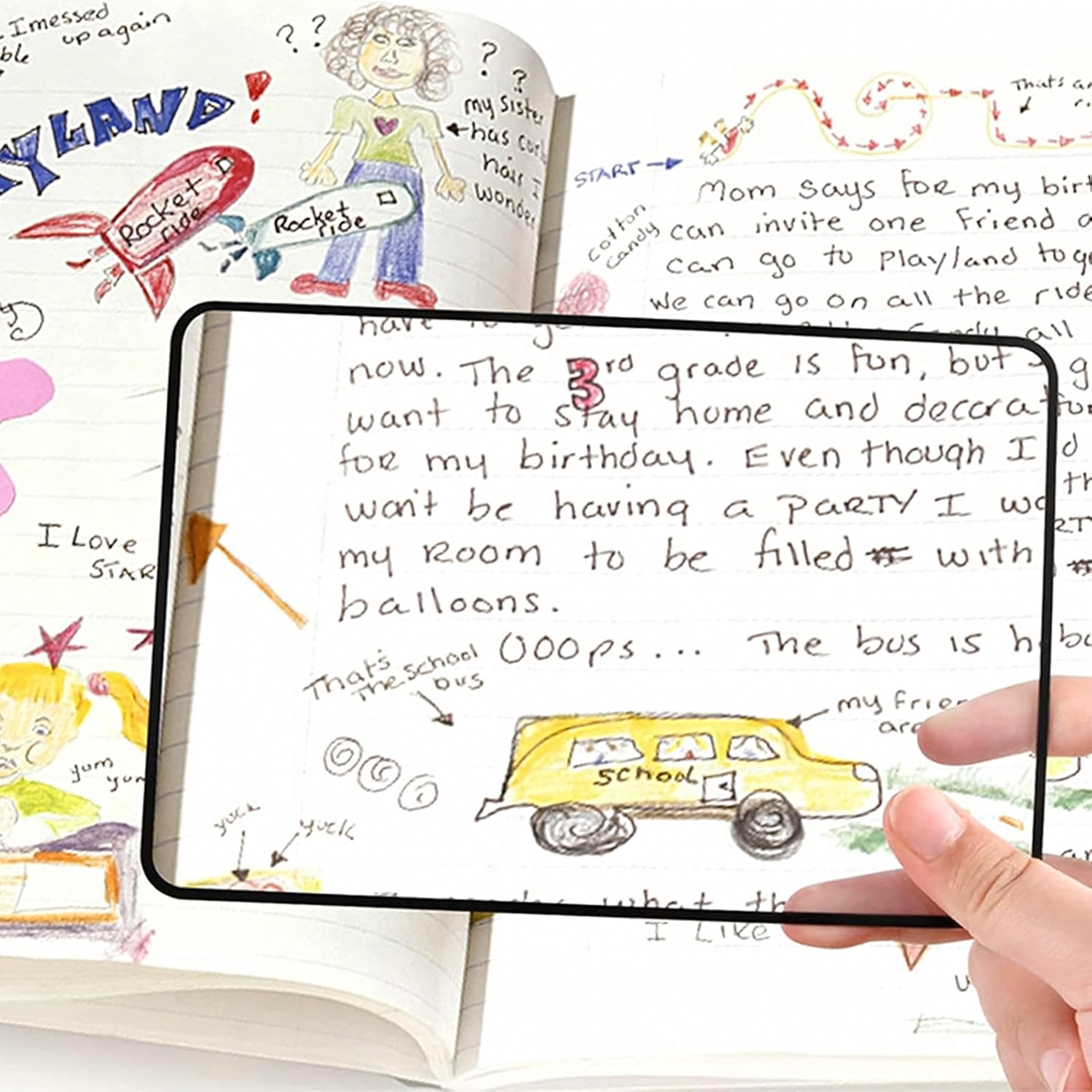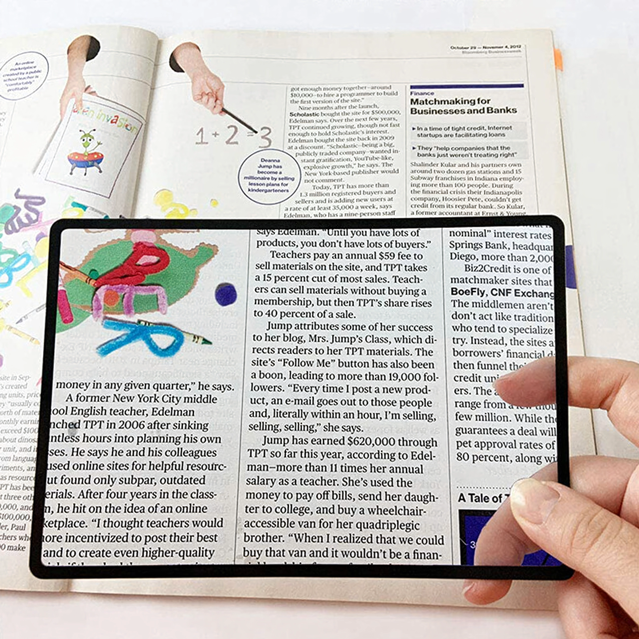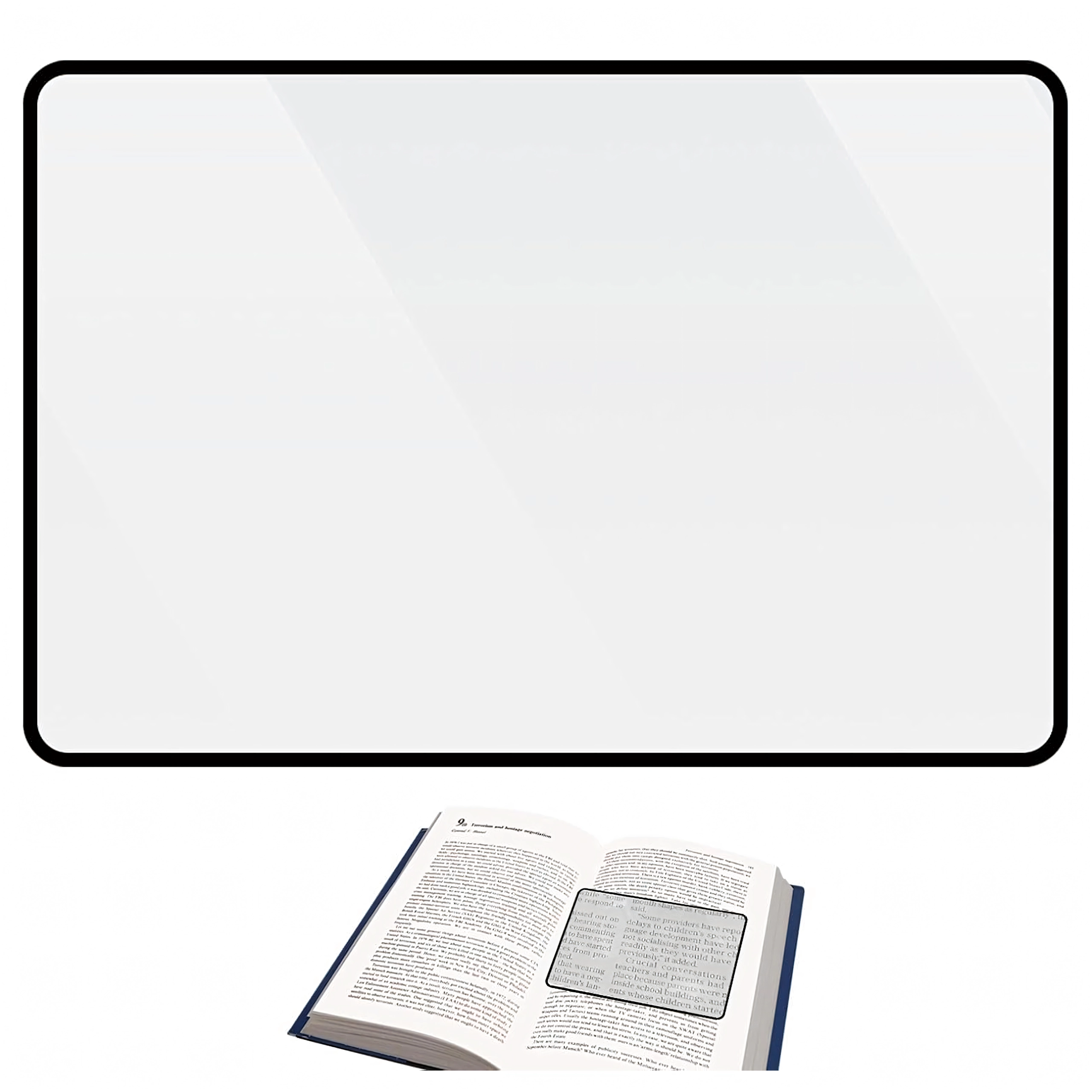 Ristkülikukujuline lääts katab suure osa lehest, nii et näete teksti suurendatult ilma luupi pidevalt liigutamata.