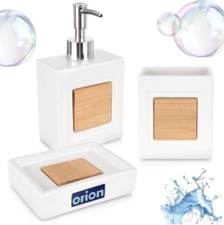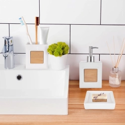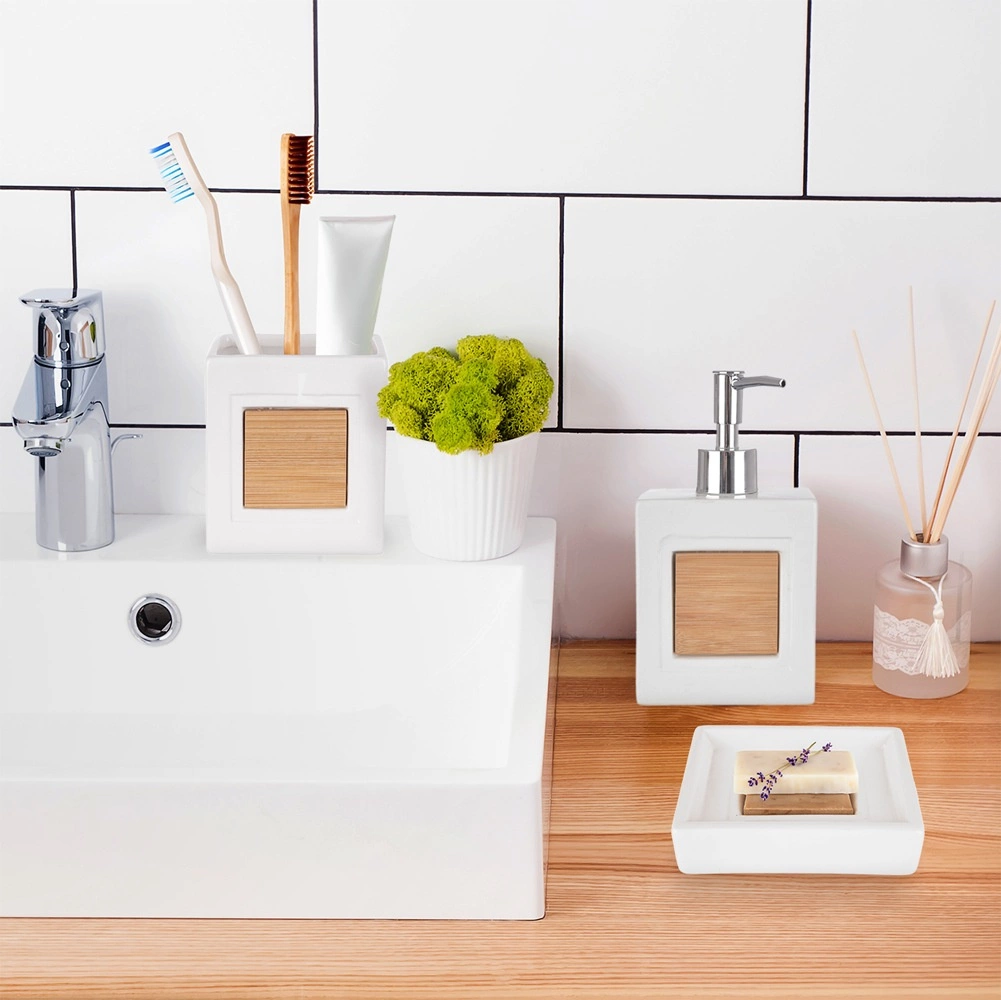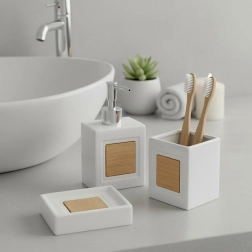 Elegantne 3-osaline vannitoakomplekt valges viimistluses ühendab vastupidava dolomiidi ja loodusliku bambuse. Komplektis on 350 ml seebidosaator, 330 ml vannitops ja seebialus. Minimalistlik disain, lihtne hooldus ja universaalne stiil nii modernsetele kui ka klassikalistele vannitubadele.