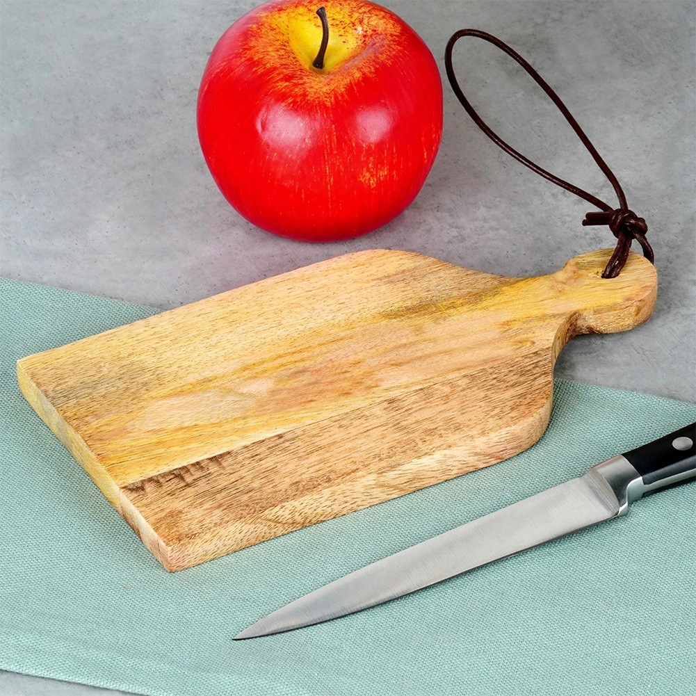 Elegantne ja mitmekülgne lõikelaud mõõtudega 19,5 × 10 × 1,5 cm sobib igasse kööki ja ka kaetud lauale. Looduslik mangopuit annab lauale suure tugevuse, pika kasutusea ja erakordse värvimustri. Kompaktne suurus sobib nii väiksemate koostisosade ettevalmistamiseks kui ka stiilseks serveerimiseks.