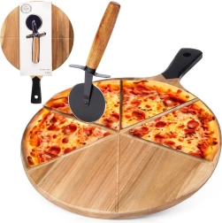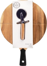 Praktiline komplekt pitsaarmastajatele: akaatsiapuidust laud juhikraavidega 6 võrdseks tükiks ja metallist pitsalõikur puidust käepidemega. Kahepoolne kasutus, stiilne serveerimine, mugav kandmine tänu pikale käepidemele ning vastupidavus niiskusele ja temperatuuridele kuni 70 °C.