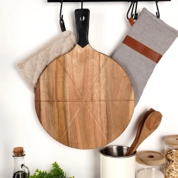 See elegantne akaatsiapuidust pitsalaud on loodud täpseks tükeldamiseks ja efektseks serveerimiseks. Ühel küljel on freesitud juhikraavid lihtsaks lõikamiseks 6 ühtlaseks tükiks, teine külg on sile ning ideaalne juustu, lihalõikude või saiakeste serveerimiseks. Komplektis on terav roostevabast terasest lõikur puidust käepidemega puhta, sujuva lõike jaoks.
