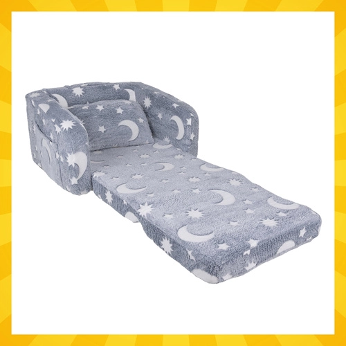 Pehme mugavus ja lõbu üheskoos – kokkuklapitav laste tugitool Kruzzel muutub hõlpsasti lamamistooliks lugemiseks, puhkuseks ja muinasjuttudeks. Ülkerge, ohutu ja kergesti kaasaskantav, praktilise küljetasku ning õrna plüüsist kattega. Fluorestseeruvad kuud ja tähekesed helendavad pimedas õrnalt ja loovad rahustava õhkkonna rahulikuks uinumiseks.