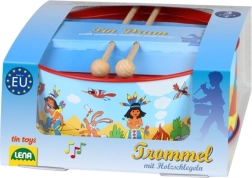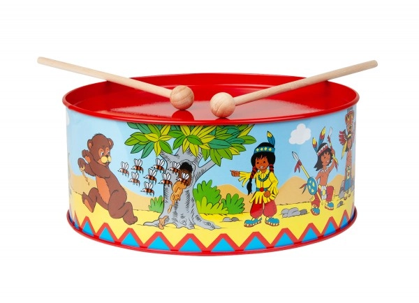 Laste trumm indiaani mustriga, läbimõõt 20 cm, rõõmustab väikseid muusikuid. Valmistatud metallist, täiendatud tekstiili ja kahe puust pulgaga. Kaasas on kaela ümber riputamiseks nöör. Arendab koordinatsiooni, rütmitunnet ja armastust muusika vastu.