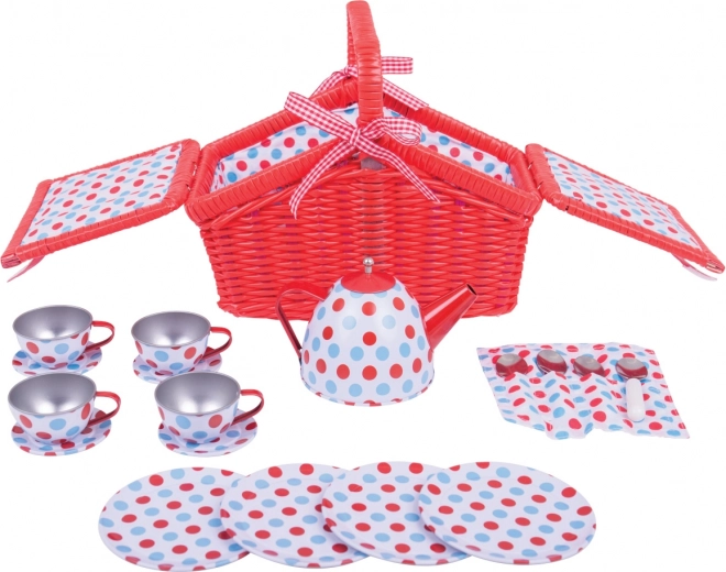 Võluv teekomplekt punases vitstkorvis toob mängurõõmu. Sisaldab nelja tassi, taldrikuid, teekannu ja teesegamislusikaid – ideaalne laste teejooja-mängudeks nii kodus kui ka teel.