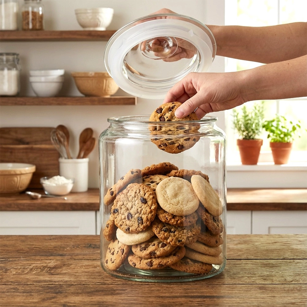 Kaas läbipaistva tihendiga tagab kindla õhukindluse, nii et toiduained ei niisku ega kaota aroomi – ideaalne kohvile, teele ja küpsistele.