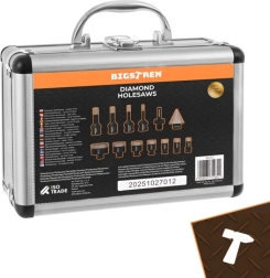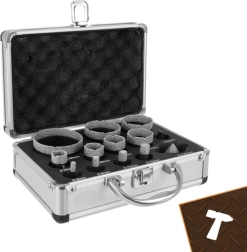 - 11× teemantkroon, 1× kooniline frees 2–35 mm, 1× adapter puurmasinale, tugevdatud alumiiniumkohver, mitmekeelne juhend
