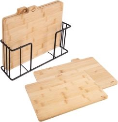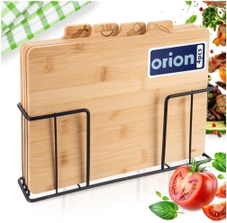 Kvaliteetsest bambuspuust lõikelauakomplekt toob köögitasapinnale korra ja tagab maksimaalse hügieeni toidu ettevalmistamisel. Selged graafilised ikoonid sakkidel lihtsustavad õige lõikelaua valikut konkreetsetele toiduainetele ja aitavad vältida ristsaastumist. Stabiilne metallhoidik säästab ruumi, tagab kiire kuivamise ja korrastatud hoiustamise.