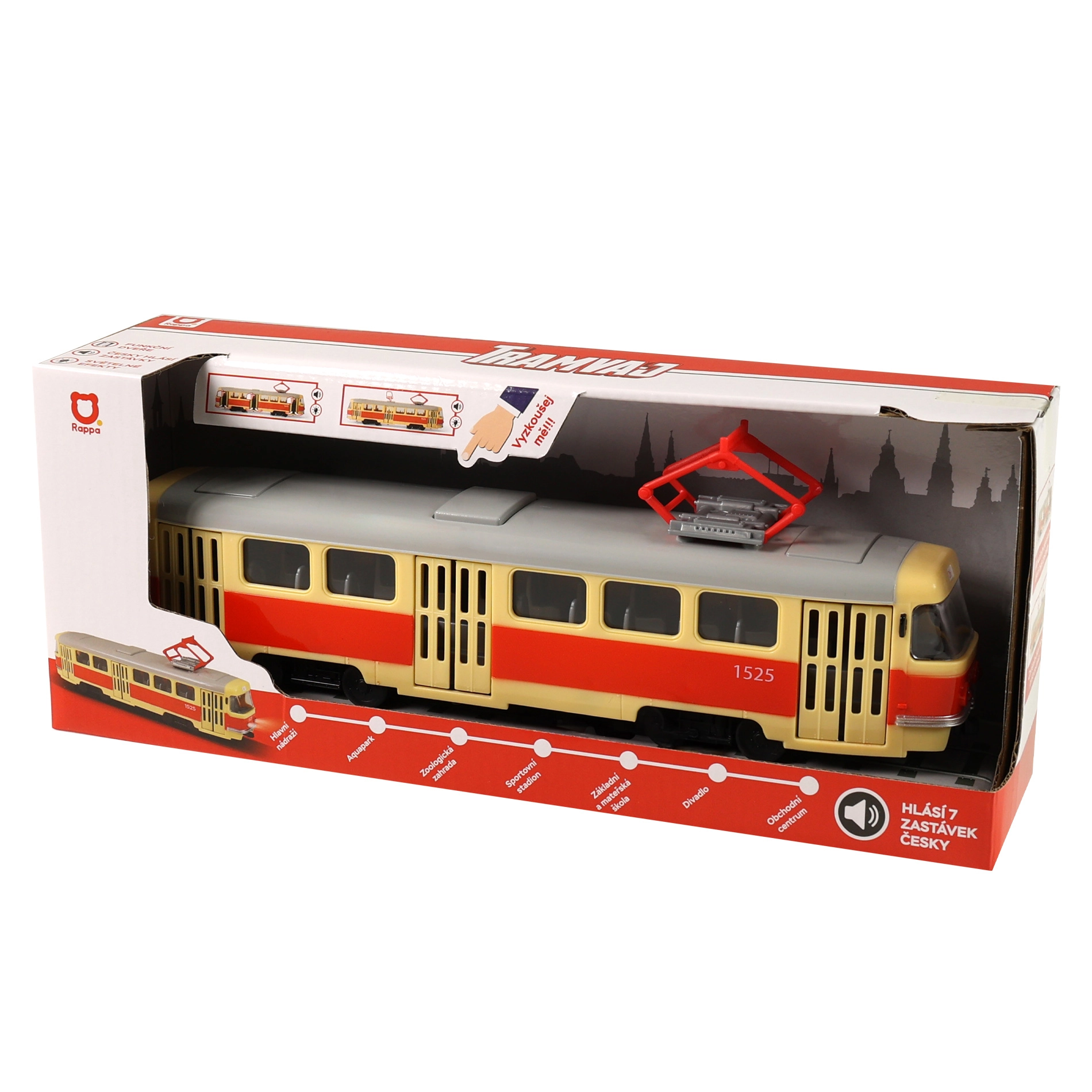 Iga ukse avamine ja sulgemine käivitab autentse teadustuse tšehhi keeles – lapsed saavad mängida nagu päris trammis.