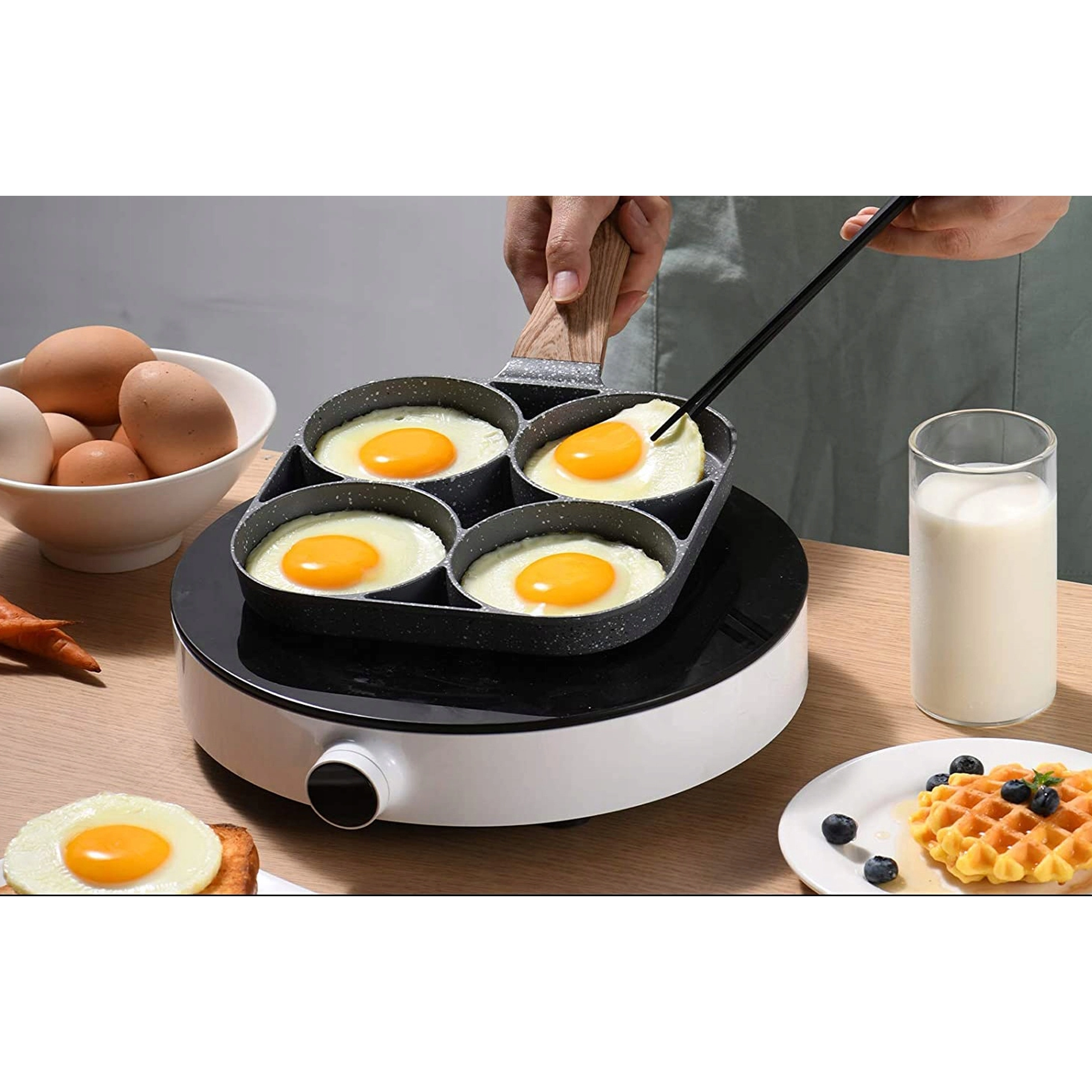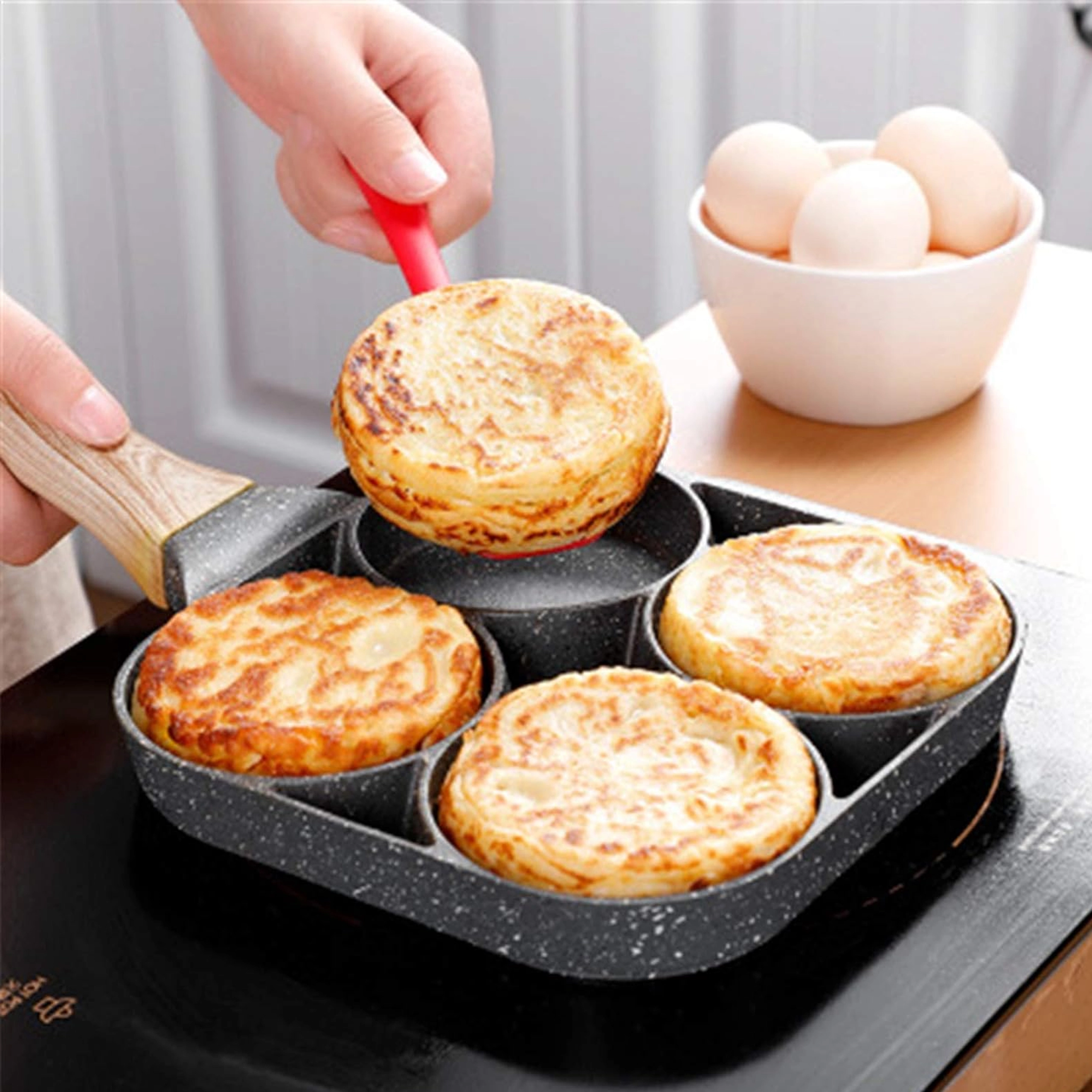 See neljasektsiooniline pann on ideaalne kiireks ja tasakaalustatud hommiku- või vahepalade valmistamiseks. Eraldi kambrid hoiavad portsjonid kaunilt ümmargused ja ühtlased, samal ajal kui täpiline mittekleepuv pind tagab lihtsa pööramise ilma kõrbemiseta ja vaevatu puhastuse.