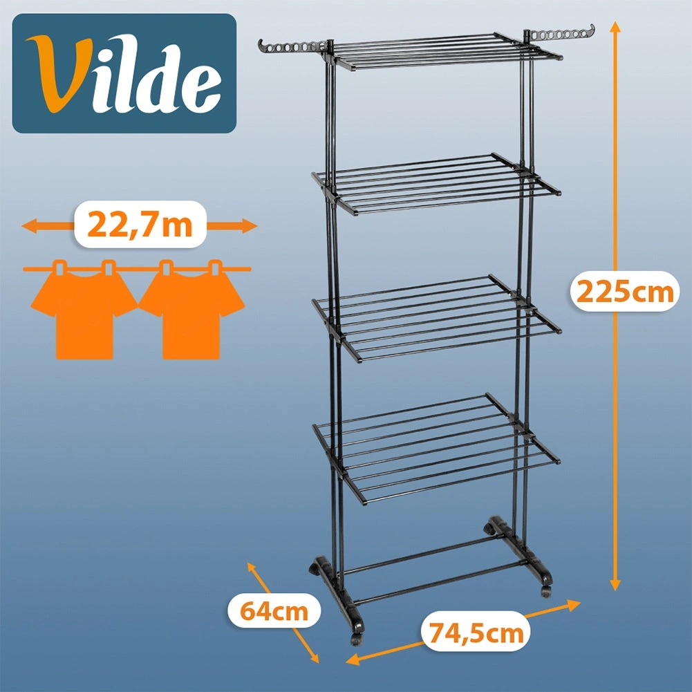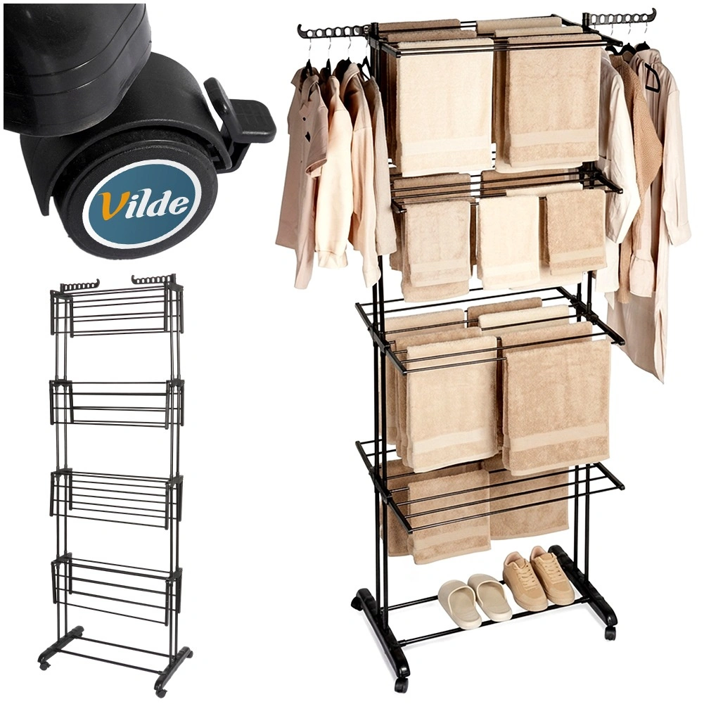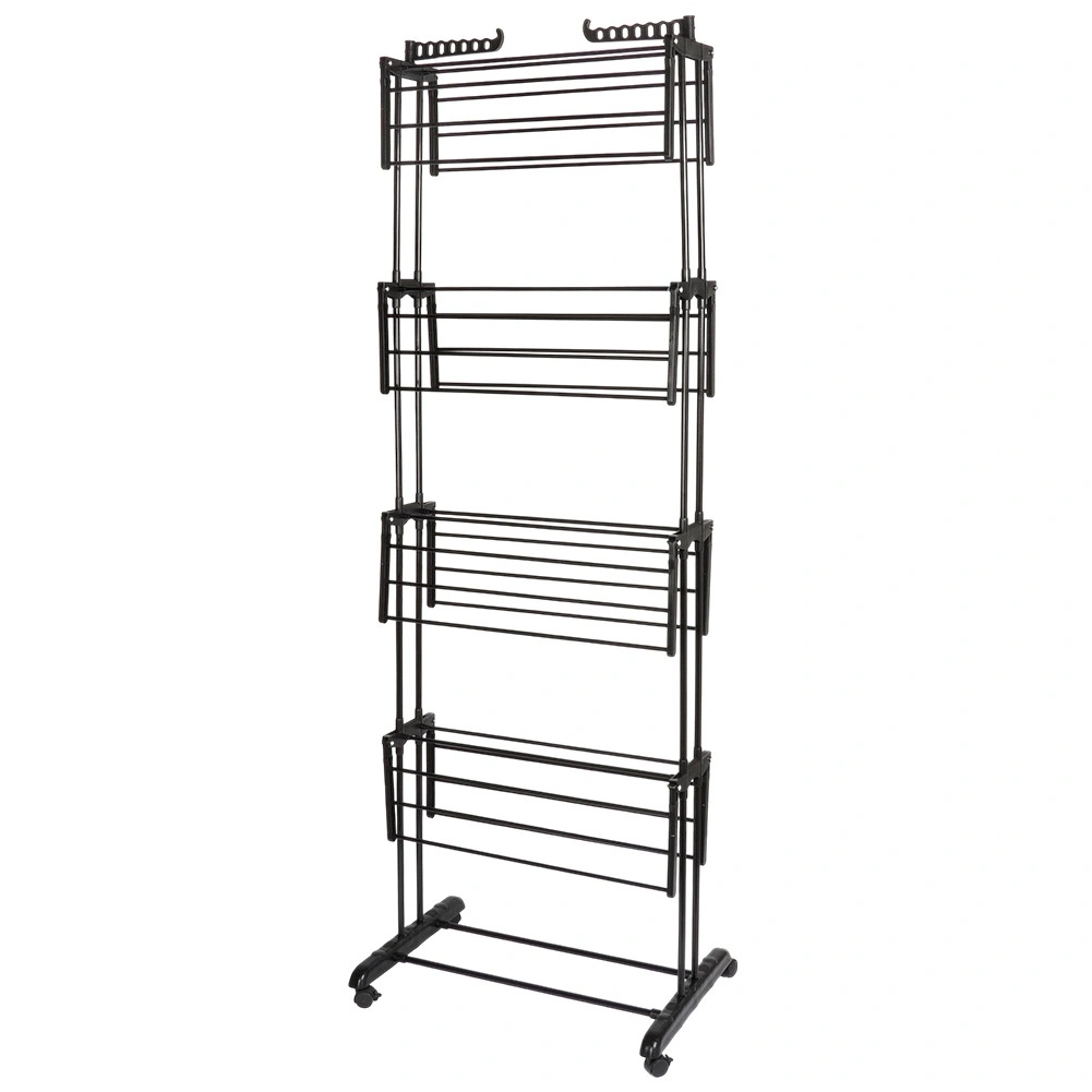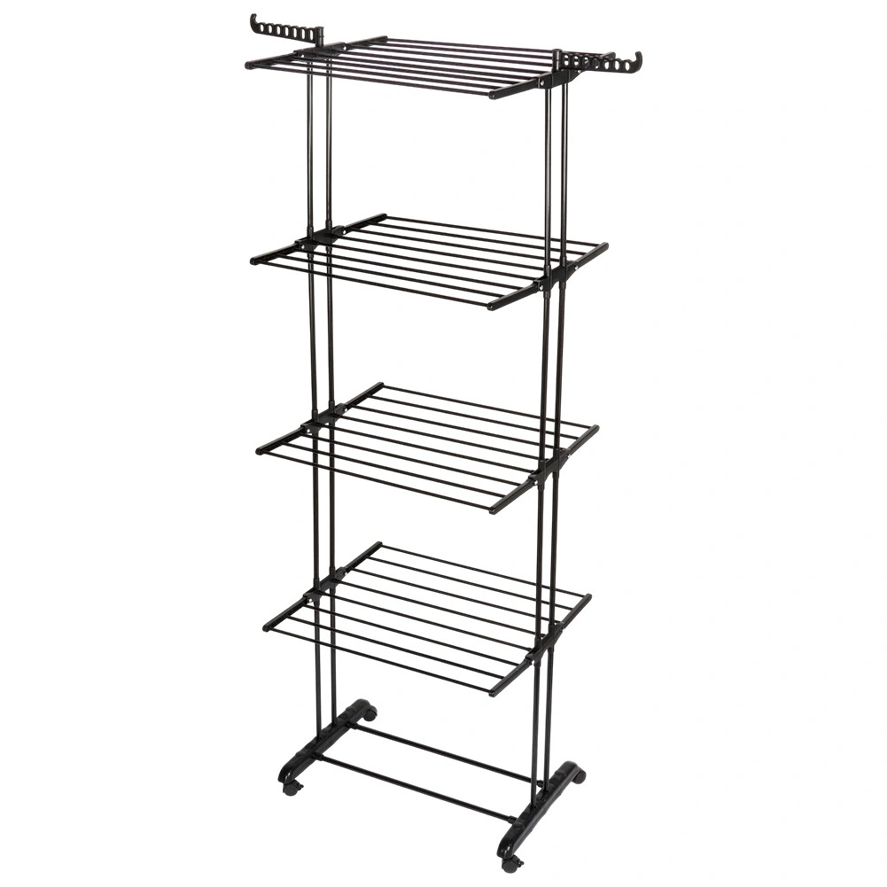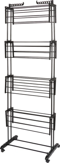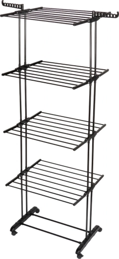 Praktiline vertikaalne pesukuivati nelja tasemega pakub kuni 22,7 m kuivatuspinda, stabiilset metallkonstruktsiooni ja piduriga rattaid lihtsaks liigutamiseks. Tänu kokkuklapitavatele tiibadele, külgmistetele riidepuuhoidjatele ja alumisele riiulile jalanõude jaoks kasutab see maksimaalselt ära ruumi nii kodus kui ka rõdul.