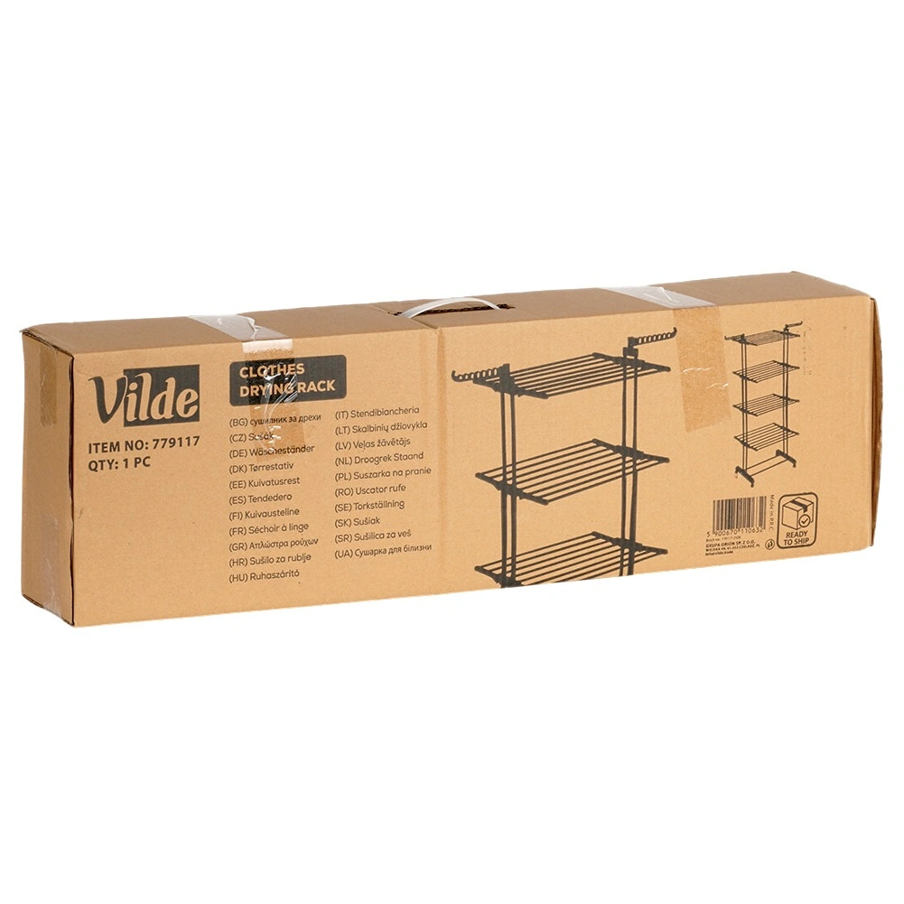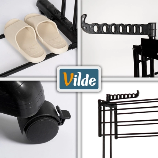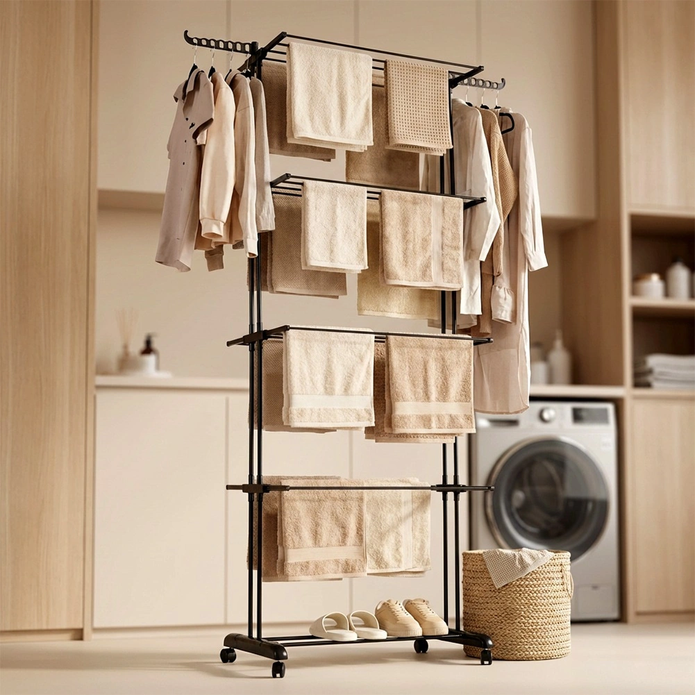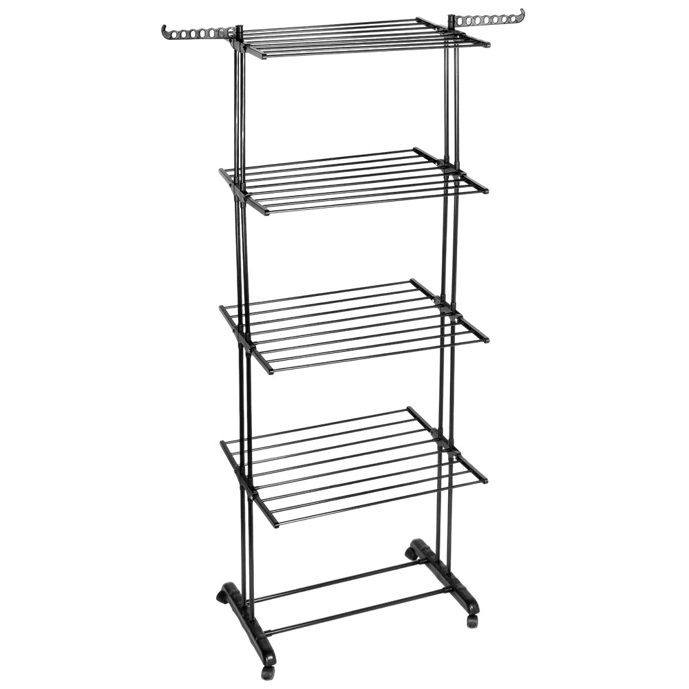 Praktiline vertikaalne pesukuivati nelja tasemega pakub kuni 22,7 m kuivatuspinda, stabiilset metallkonstruktsiooni ja piduriga rattaid lihtsaks liigutamiseks. Tänu kokkuklapitavatele tiibadele, külgmistetele riidepuuhoidjatele ja alumisele riiulile jalanõude jaoks kasutab see maksimaalselt ära ruumi nii kodus kui ka rõdul.