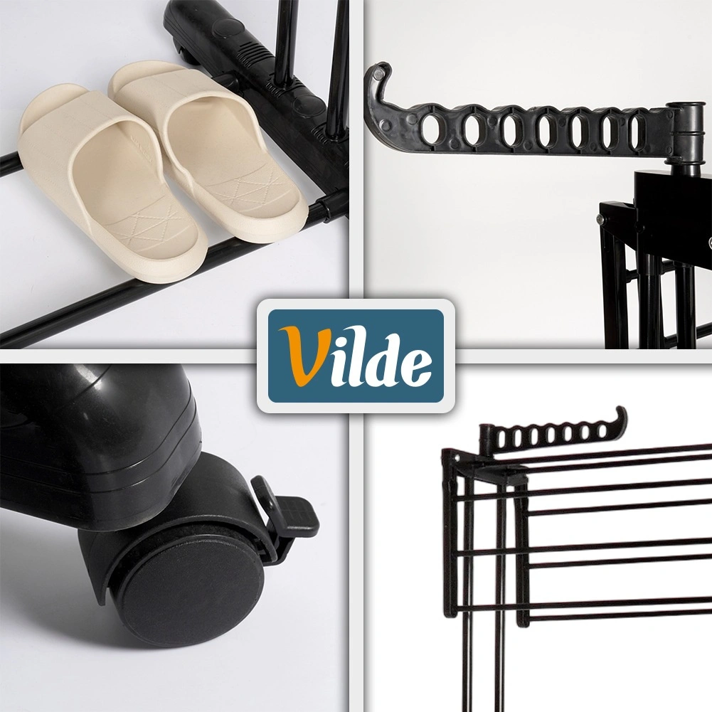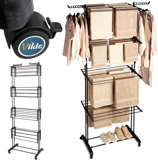 Vastupidav pulbervärvitud metallkonstruktsioon on stabiilne ja niiskuskindel, sobides kasutamiseks nii siseruumides kui ka välitingimustes (rõdu, terrass, aed). Neli ratast tagavad lihtsa teisaldamise, neist kaks on piduriga turvaliseks fikseerimiseks. Alumine riiul sobib suurepäraselt jalanõude kuivatamiseks ja tarvikutele.